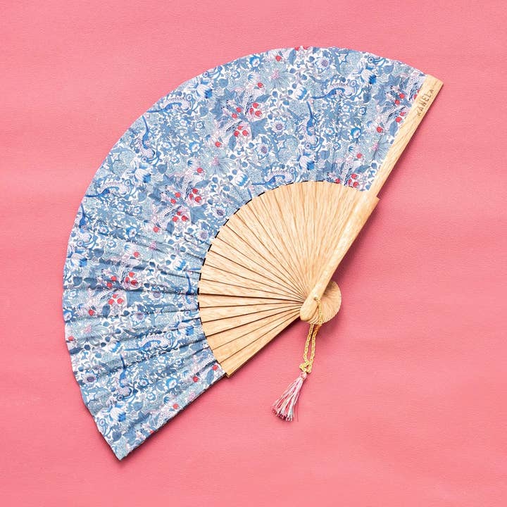 Fan in natural, polished Sipo wood, with two printed 100% cotton fabrics. Gold ring detail with chain and cotton tassel. Size - 27x52 cm.