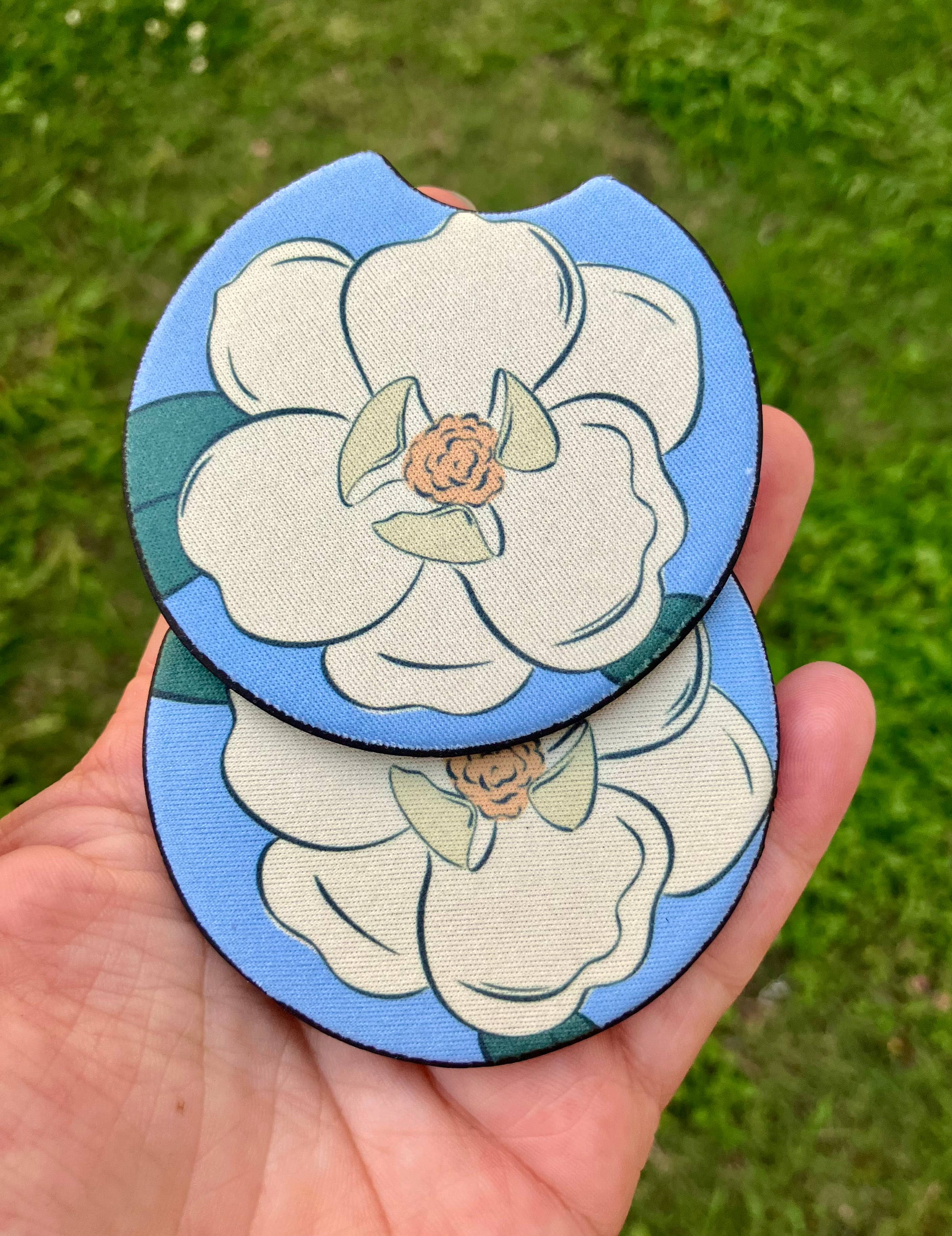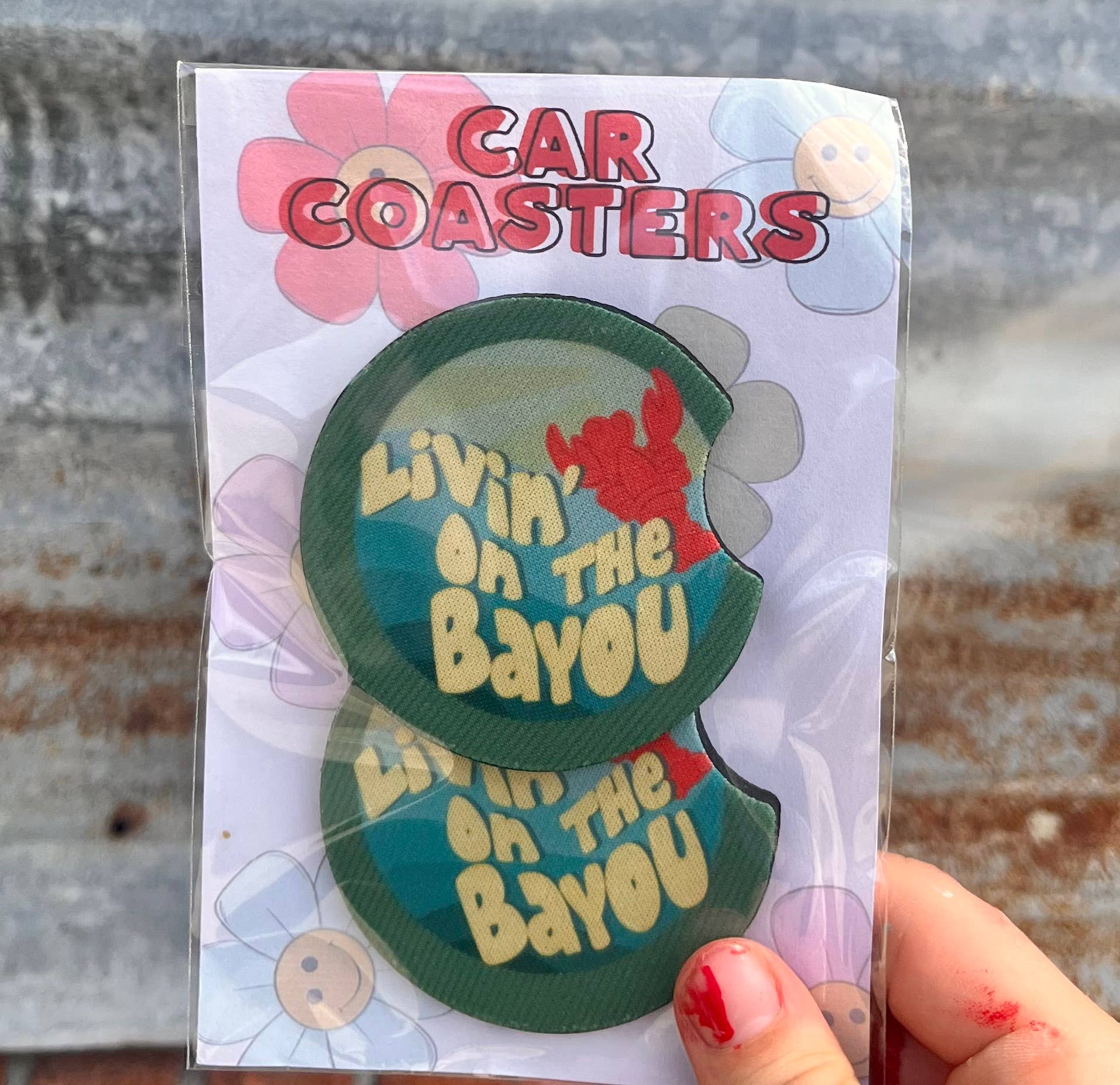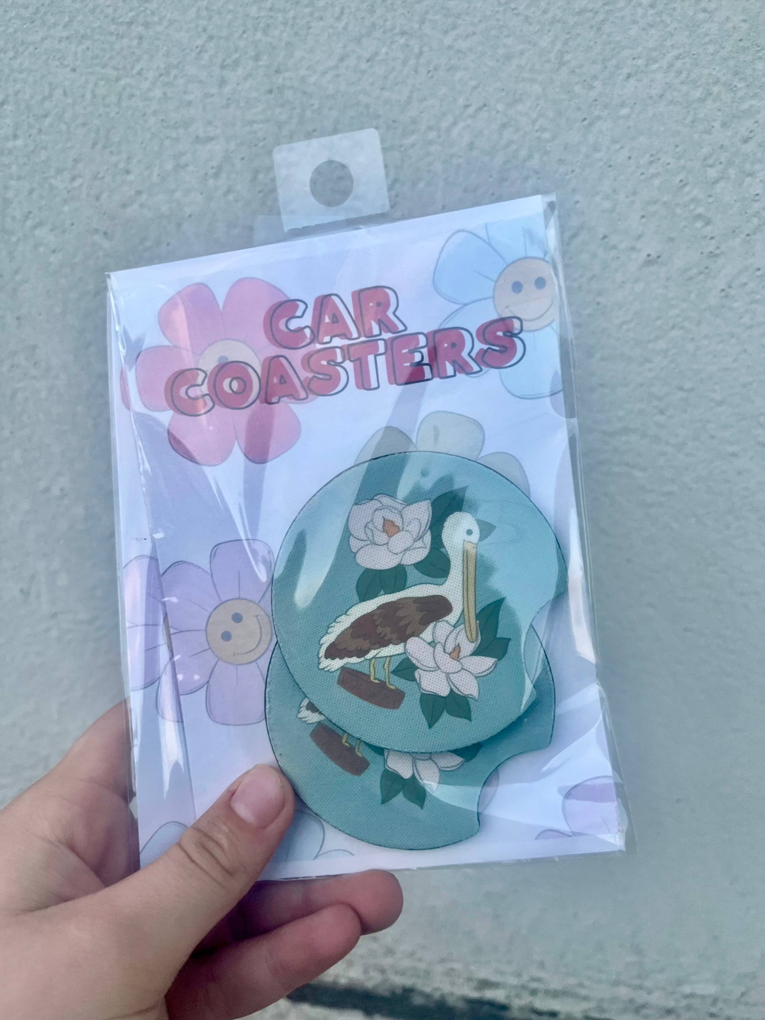 Our car coasters are made from neoprene. They are super thick without exclusive designs on them. They are all sublimated in house. Car coasters come in a pack of 2. Individually packaged.