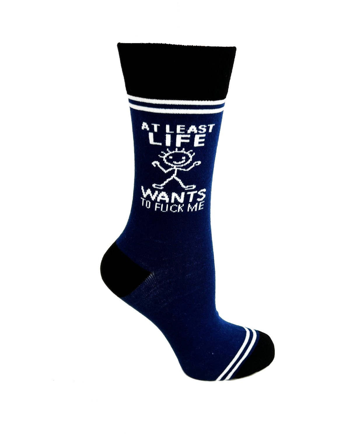 Each individual pair is packed on a card, folded, peg hook ready, UPC coded, ready for individual retail sale. Sold in Multiples of 3 Here We Fuckin’ Go Again, I Mean Good Morning Unisex Crew Socks One-Size-Fits-Most Men and Women 97% Polyester, 3% Spandex Easy Care - Machine Wash Stylish and comfortable! Hey Now designs and lettering are knitted for durability. Cheap imitations print their lettering which doesn't hold up from wearing and washing. Item # HN0064 Designed in Chattanooga, TN by our in-house artist.