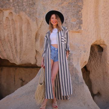 Anthracite Striped Long Linen Shirt Dress