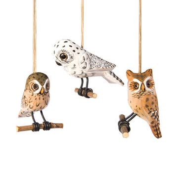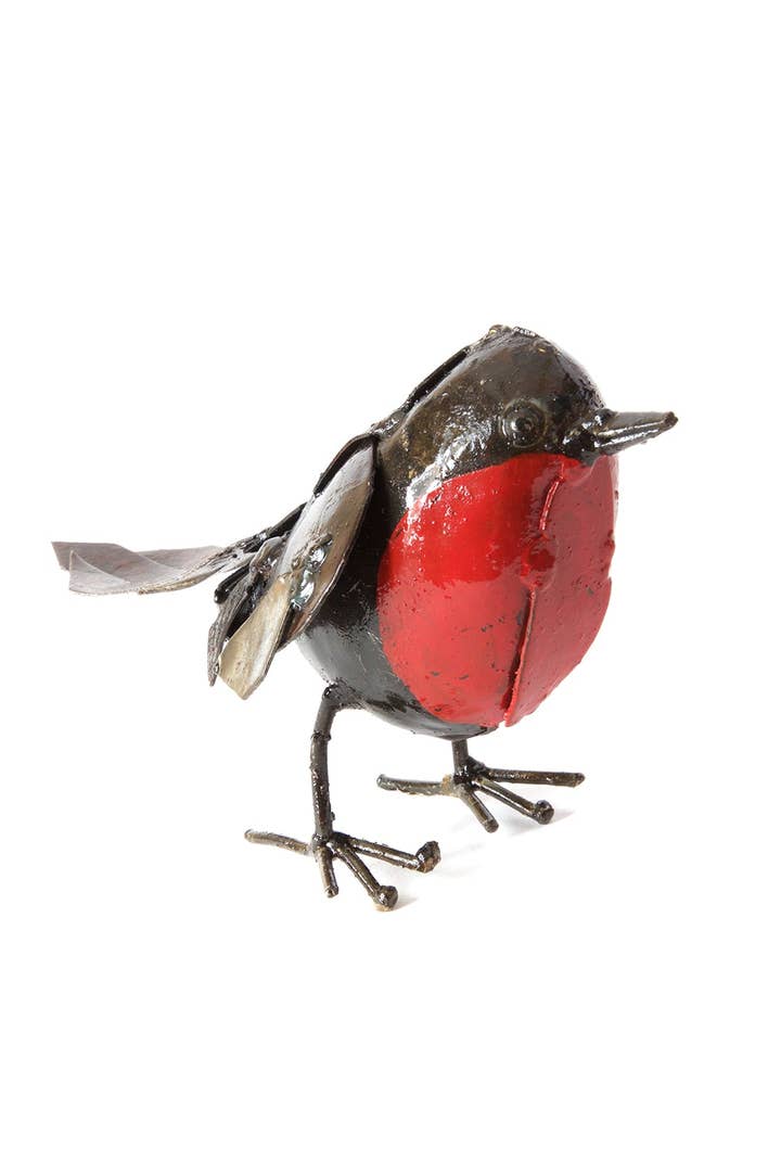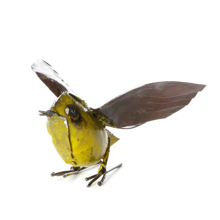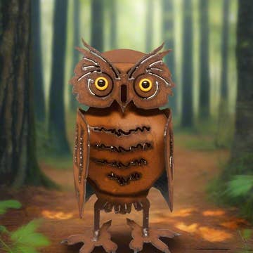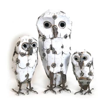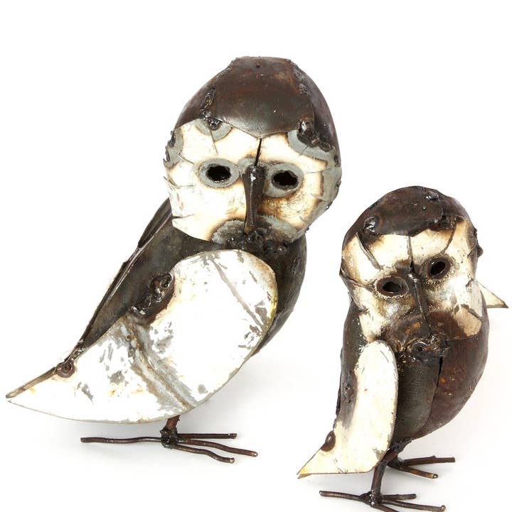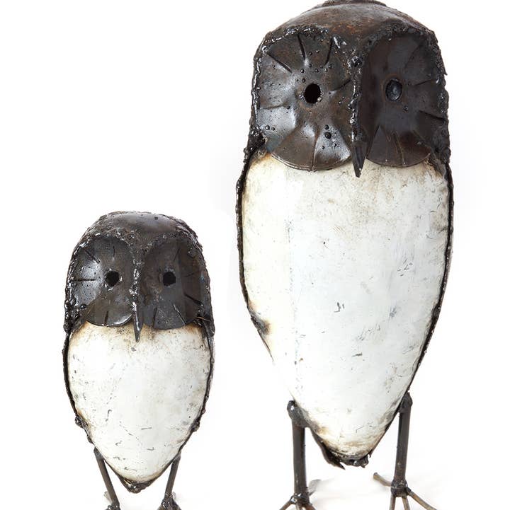 In Zimbabwe, a cooperative of talented metal workers transform recycled scrap metal into horned owl sculptures. A perfect addition to the home or garden, each owl exhibits unique characteristics. Sold singly, three sizes available. Because this is a handcrafted item, each will vary slightly. Please note that weathering should be expected if the sculpture is exposed to the elements over a long period of time. Dimensions: Small: 2.5"L x 2.5"W x 6"H Medium: 3.5"L x 3.5"W x 9"H Large: 4"L x 4"W x 11"H Crafted from: Recycled metal, paint