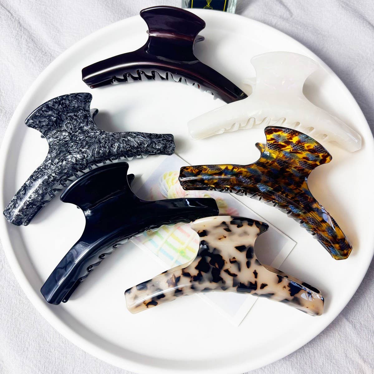 Our French claws are sturdy and unique. Made with our custom acetate and stainless steel these claws are sturdy and beautiful. These claws are best suited for medium thickness for a full French knot to be achieved. Size 3.5 inch length All of our pieces are made from cellulose acetate. A mixture of cotton pulp and acetic acid. It is a biodegradable and eco-friendly material. Acetate is lightweight yet durable. Our acetate is sourced from Italy and Japan and then manufactured and finished in both China and Idaho. We are a small, Woman-Owned business located in Boise.