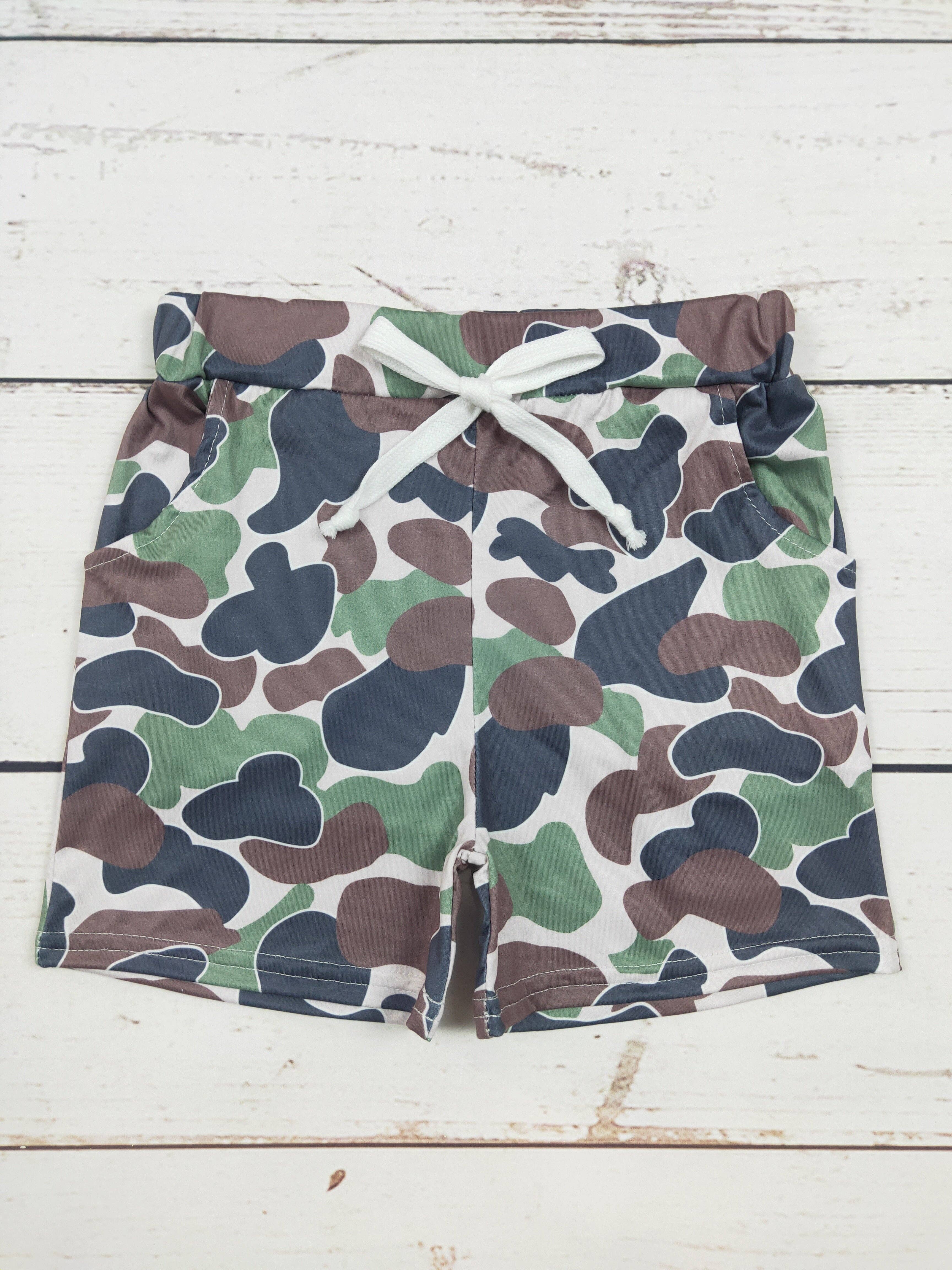 Boys Camouflage Shorts With Pockets ETA: 8-10 Days High-quality and durable, these shorts are perfect for outdoor adventures. With reliable pockets, your belongings will stay secure while you explore. Material is polyester