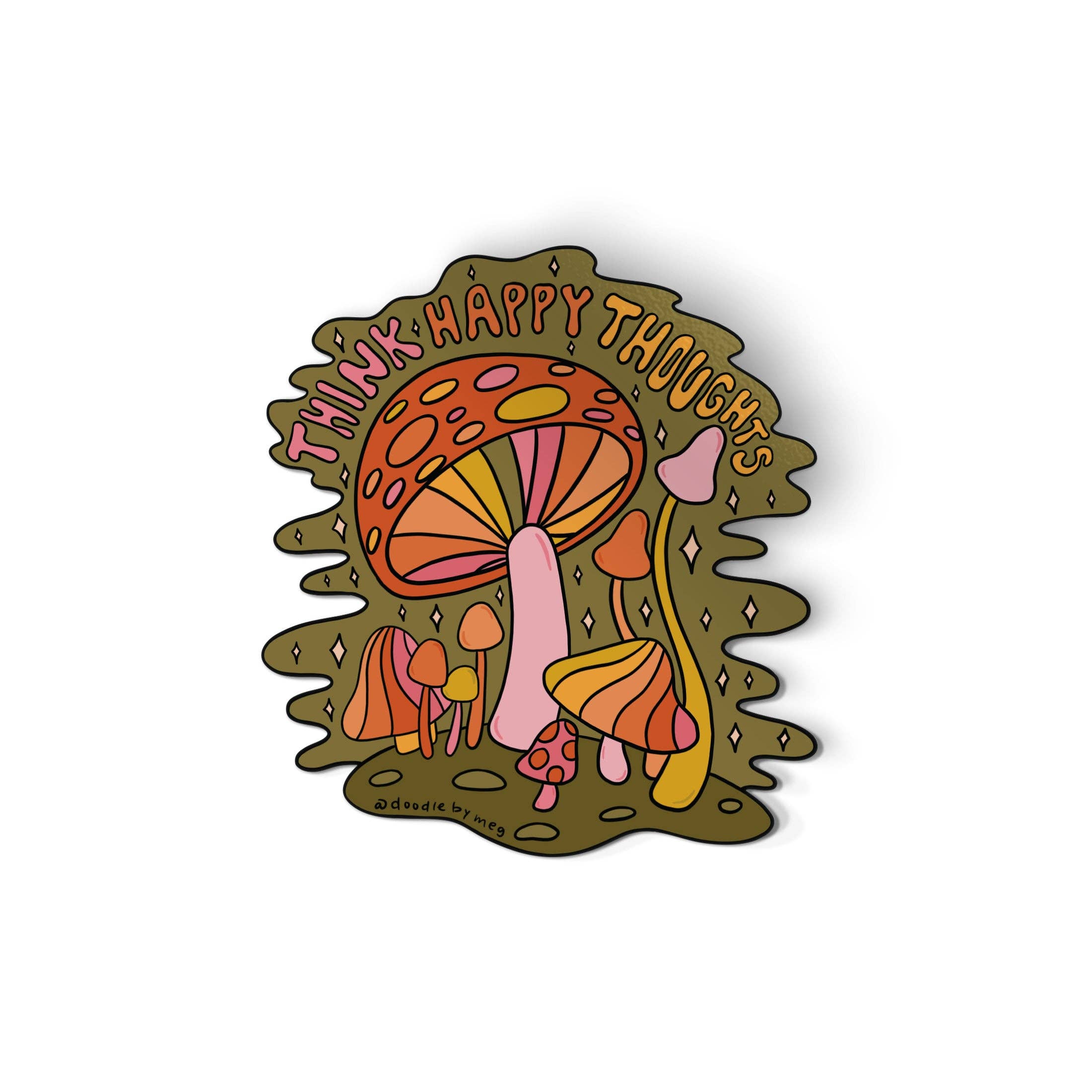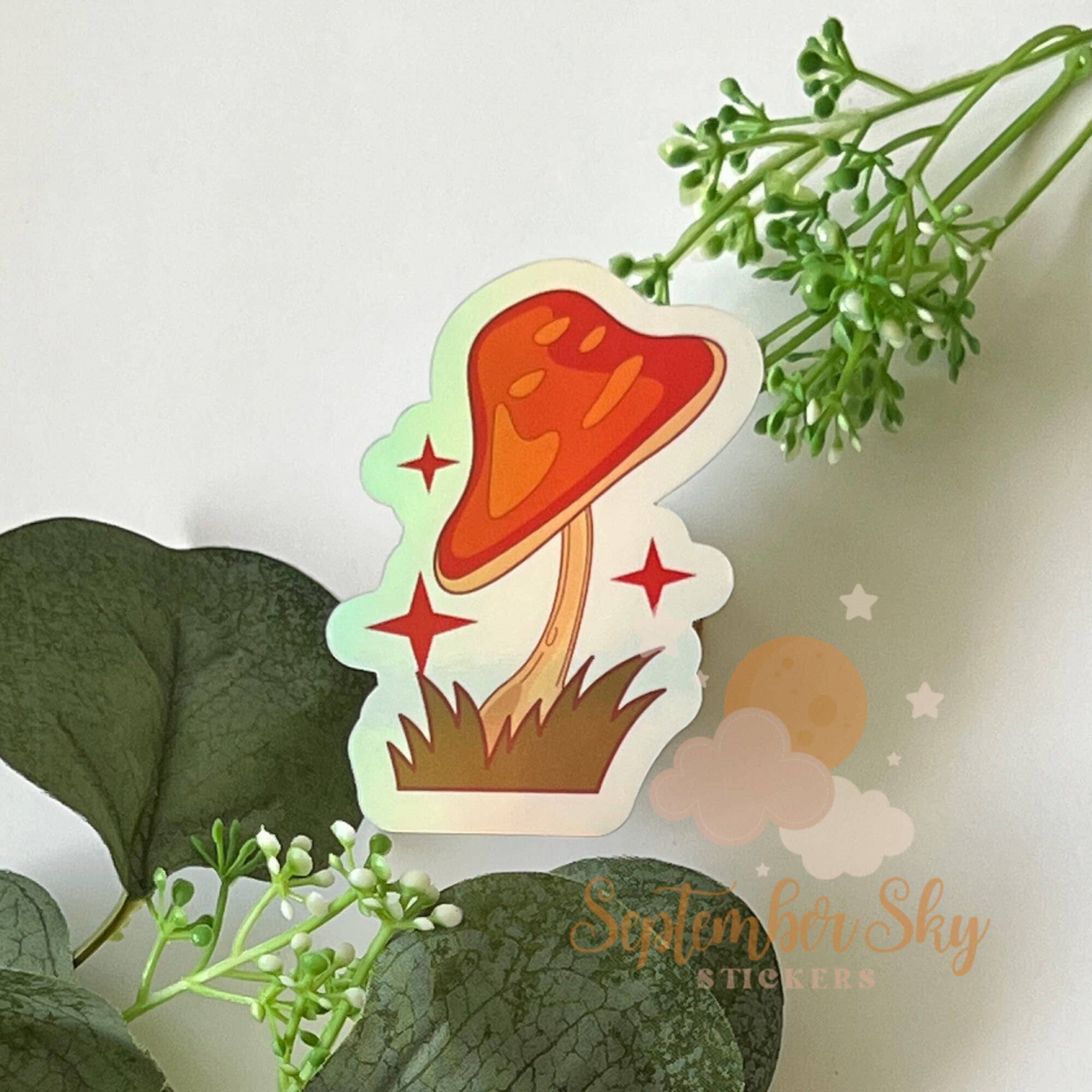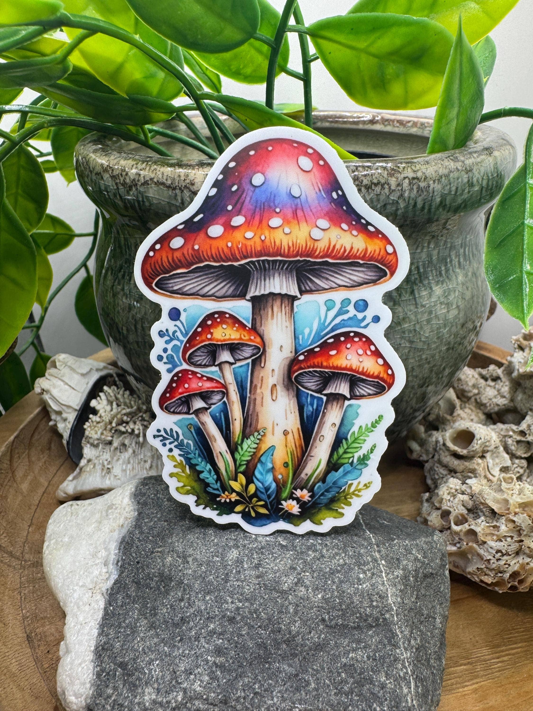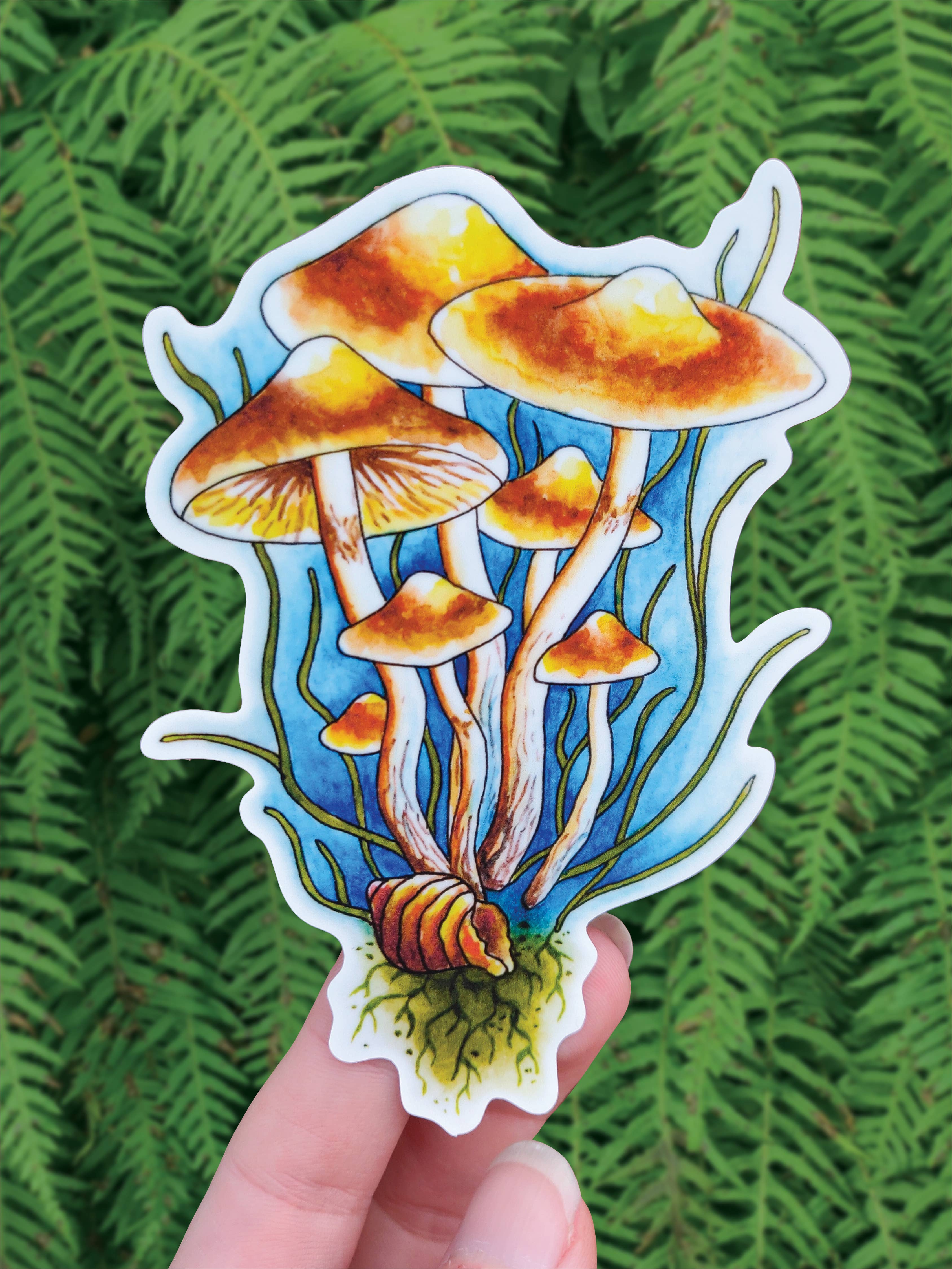 A bundle of mushrooms; Chanterelle, Boletes, Morel. Details: - Vinyl Sticker - Waterproof and Dishwasher safe - 3 inches H x 3 inches W - Sold individually