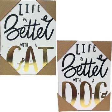 Life Is Better With Pets Beaded Sign sells as an assortment of two wooden signs. Sign has a weathered white finish for a rustic look and it reads, "life is better with dogs" in black text with two black paw print accents or, "life is better with cats" in black text with two black paw print accents. Sign comes ready to hang by a black beaded hanger and it measures 7" high by 7" wide by 1" deep. Please note: This item features an assortment of designs which are priced and sold individually (not as a set). When you order a quantity of 6, you will receive 3 of each style. Color or design is not interchangeable.
