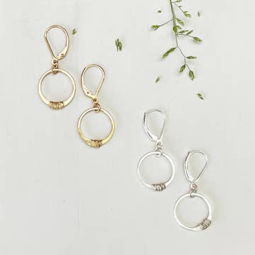 A classic hand hammered circle with an added touch of wire wrapping makes for a timeless pair of earrings that elevate your everyday hoops. Each circle measures a little over 1/2". Size: 0.5" circle diameter Leverback earwires Packaging: Letterpress Earring Card All components are sterling silver and gold filled, nickel free Handmade in our Nashville TN Studio by an all-woman team wire jewelry | hammered jewelry | classic handmade jewelry | made in Tennessee | sterling silver | gold filled | demi-fine | handcrafted | artisan jewelry | dainty jewelry | minimalist jewelry | silver earrings | gold earrings