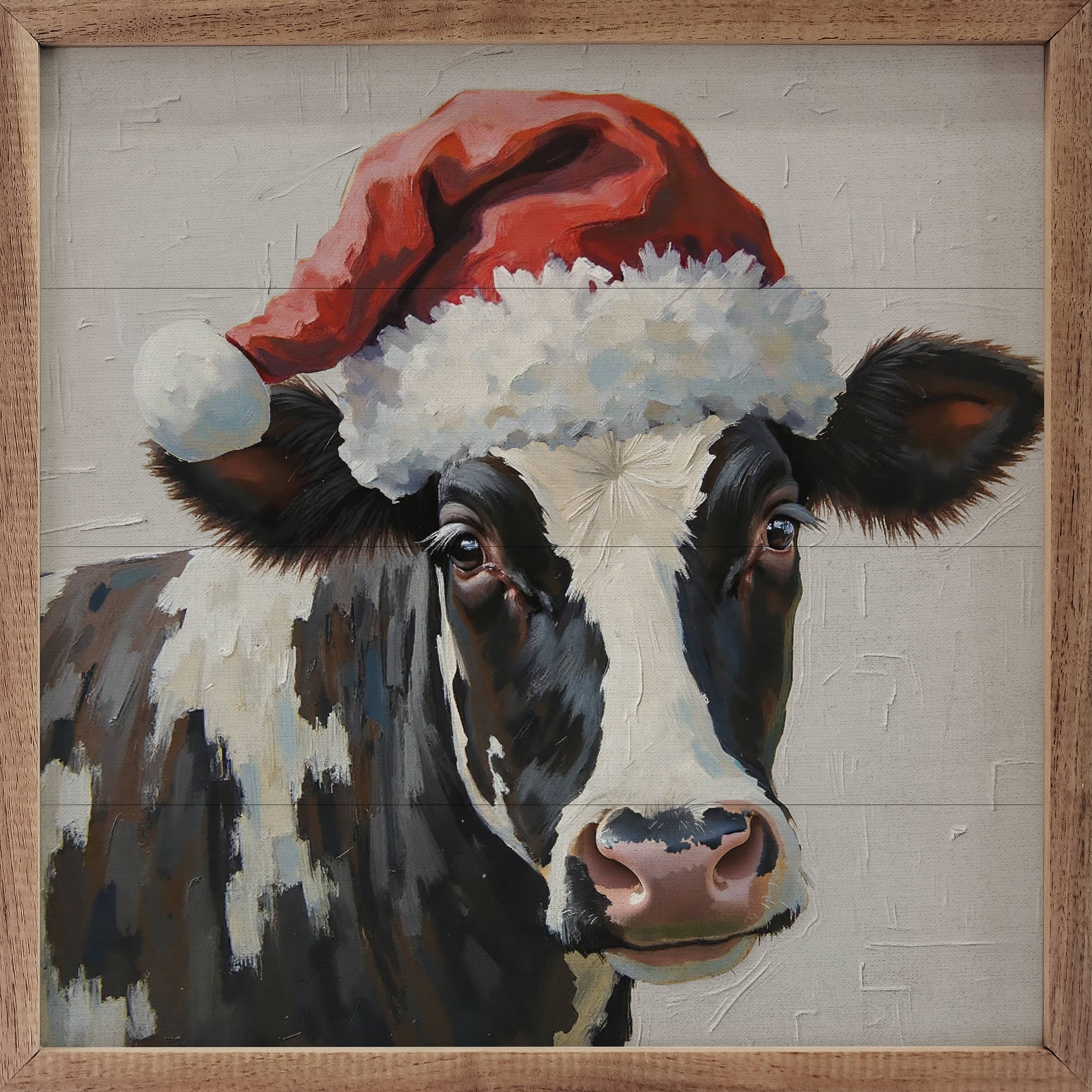 Introducing a heartwarming masterpiece that will fill your space with joy. This delightful painting features an irresistibly cute white baby cow adorned with a delicate Holly berry crown, capturing the essence of holiday charm. Hang it above your fireplace mantel or place it in your dining room to infuse any room with a touch of warmth and holiday spirit. • Printed with vivid colored inks on cotton canvas mounted on wood • Solid hardwood frame in shown stain colors • Sustainable American oak or alder wood • Made in the USA in our Utah studio • MINI 6" tall x 6" wide x 1.25" deep w/ 1/4" thick frame • SMALL 11" tall x 11" wide x 1.25" deep w/ 1/4" thick frame • MEDIUM 15" tall x 15" tall x 1.5" deep w/ 3/4" thick frame • LARGE 22" tall x 22" tall x 1.5" deep w/ 3/4" thick frame • Signs may have +/-1" variations • All signs can stand on a shelf or table (Medium & Large can also hang on a wall) • Farmhouse style frames have small rustic imperfections that make them unique