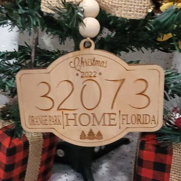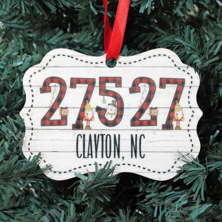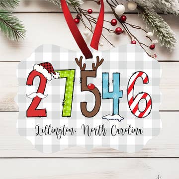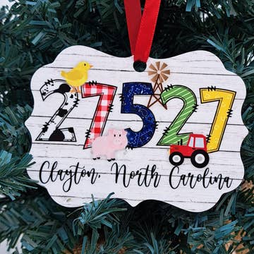 PLEASE NOTE: These are custom ornaments and you MUST provide the zip code/town/state when placing an order. We cannot accept your order without this information. A beautiful ornament featuring a unique Farm font with cute farm accents on a whitewashed wood background. Our single sided aluminum ornaments are scratch-resistant, fingerprint-free, antireflective and include a red satin ribbon for hanging. These Zip Code ornaments are perfect for adding charm and character to your tree. They also make a great gift for student gift exchanges as well or to celebrate a recent family vacation. SPECIFICATIONS ● 4"(L) x 2.76"(H) ● Made in USA Please SPELL OUT your ZIP CODE/TOWN/STATE when adding the personalization details.