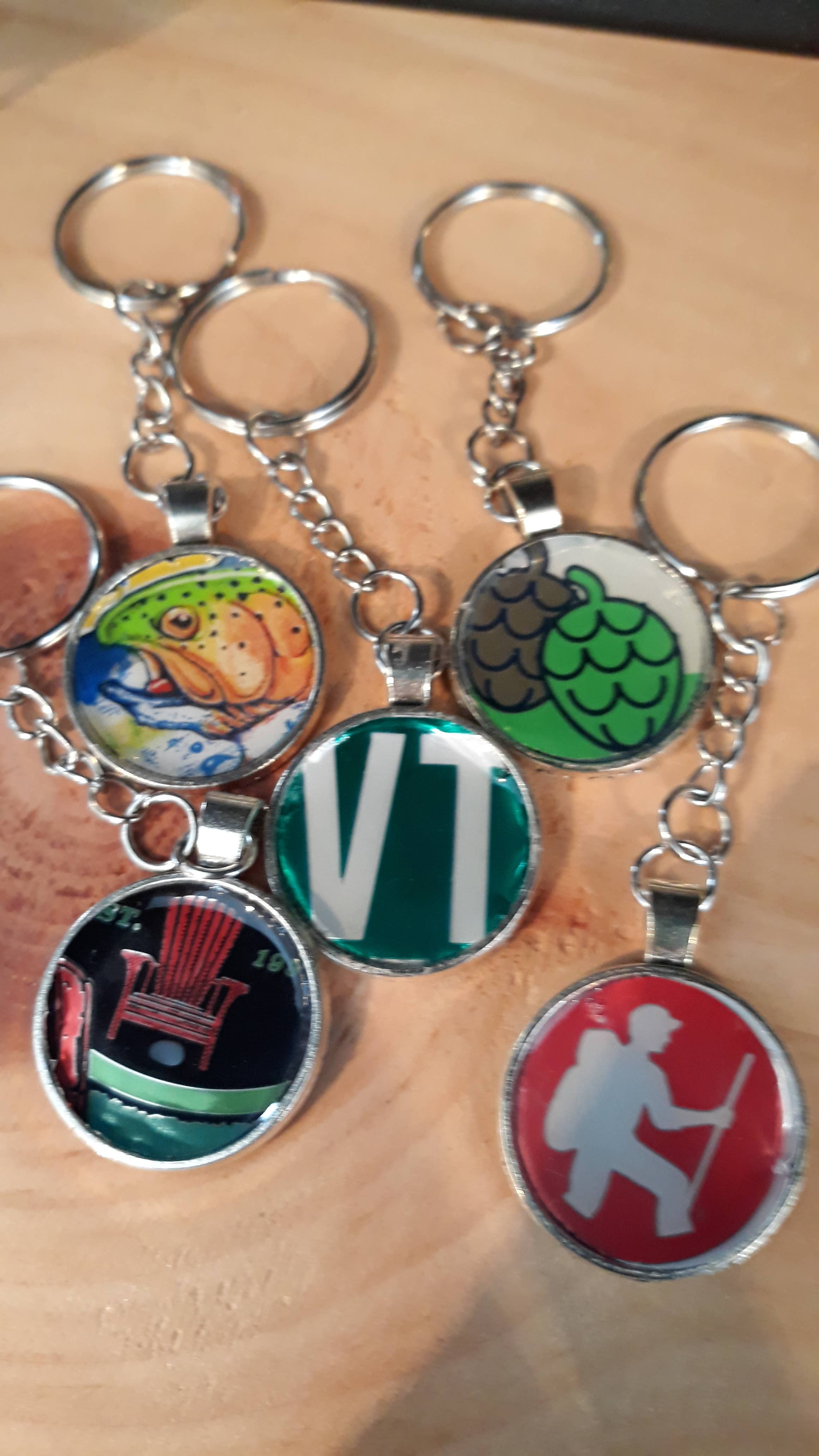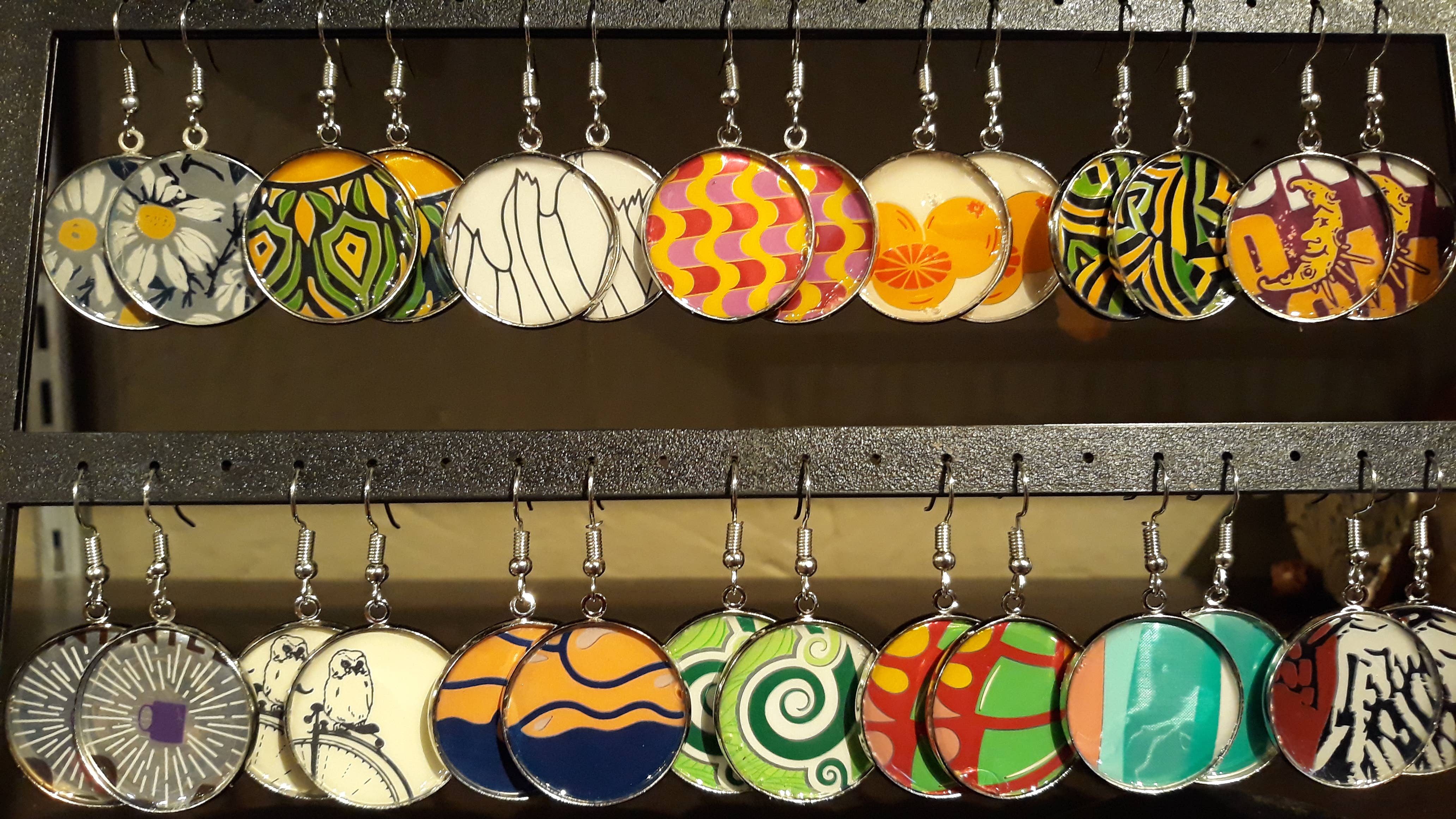 Assorted Design and Color, Earrings Made with Recycled Cans (primarily beer) Adhered to a Bezel with Resin on Top