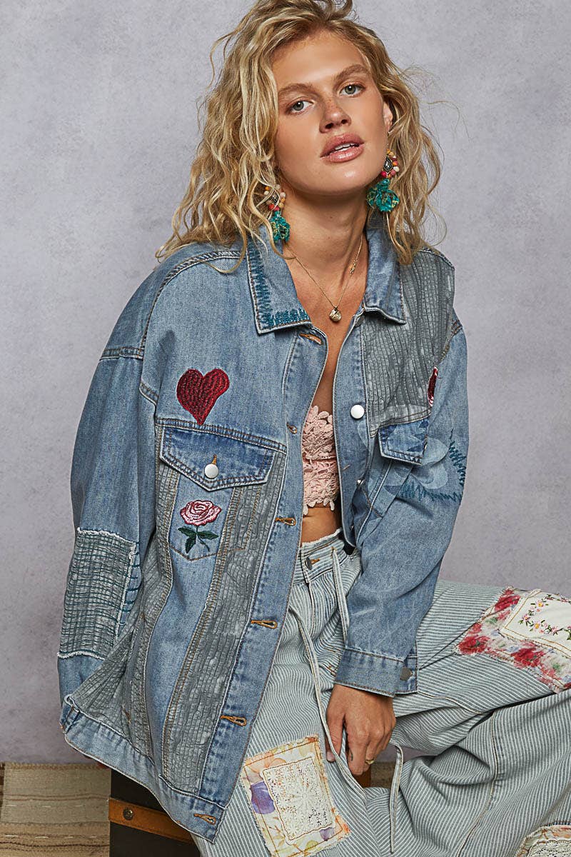 Long sleeve denim embroidery roomy fit jacket
