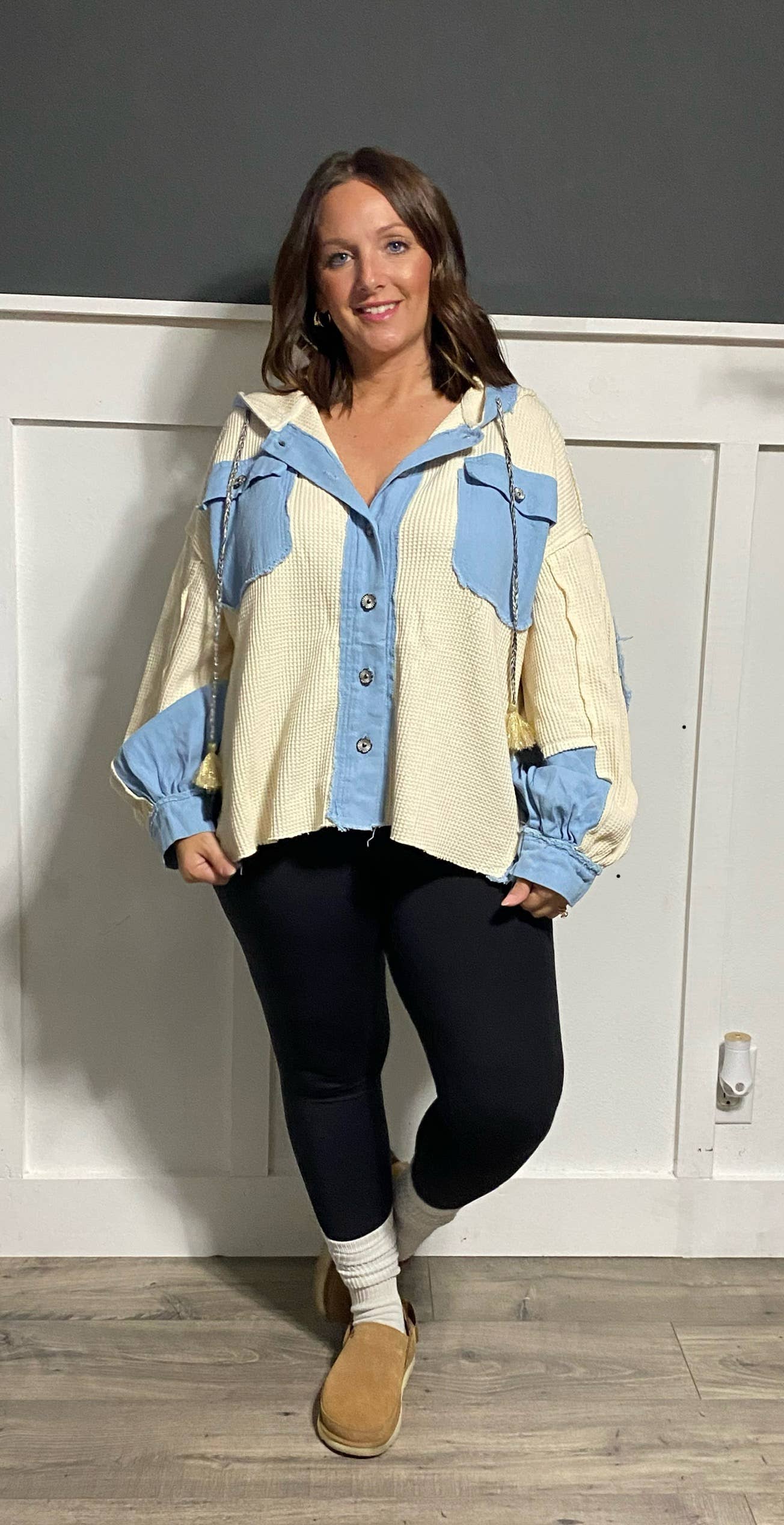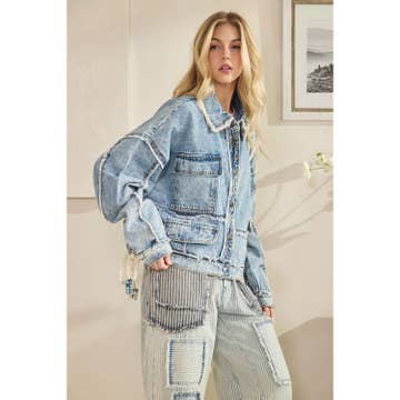 Designed in a denim jacket with functional zipper detail, oversized fit with long long sleeve, strap detailing, distressed detailing. Specs/Dimensions: - BUST: 21-1/2" - LENGTH (Front and Back): 20" - SLEEVE: 25" - SHOULDER: 20"