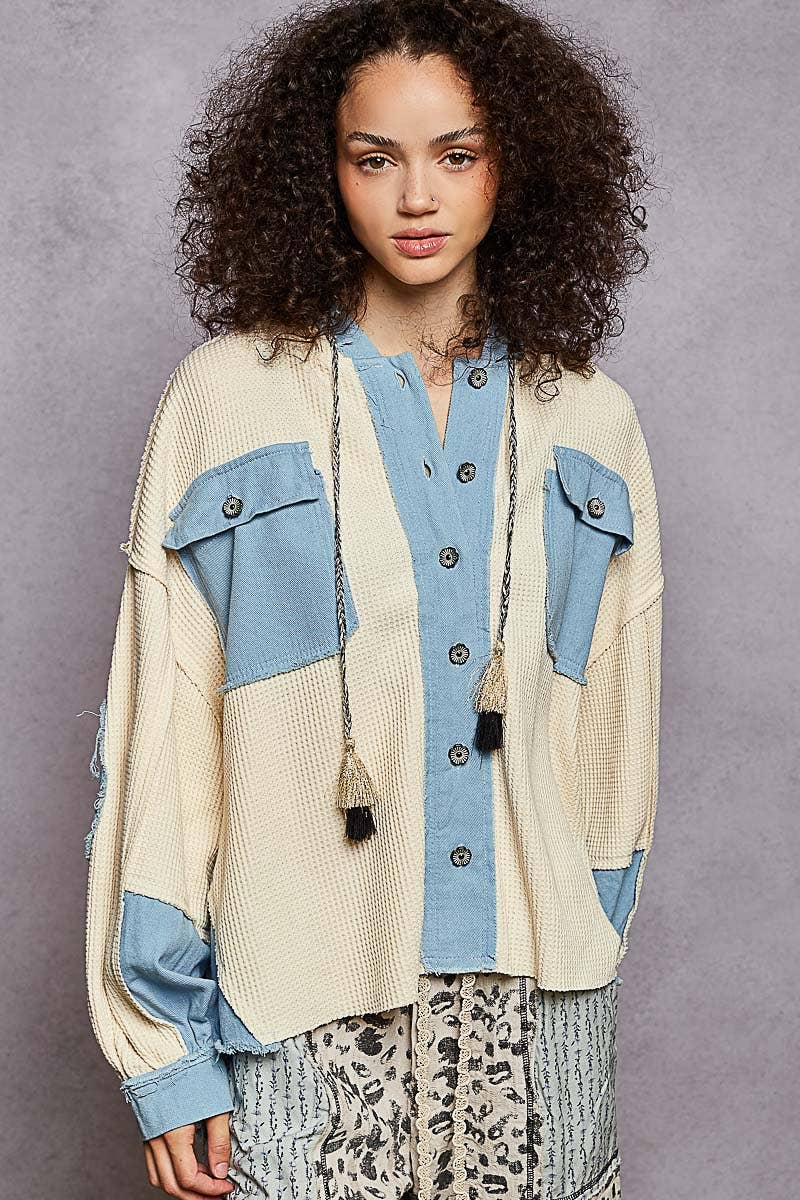 Distressed outseam patch detail button down denim jacket