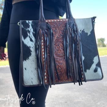 Boot stitch on the front Whipstitch and scallop trimmed detail Accented with antique silver studs Top zipper closure Inside of the bag includes a zippered pocket and a padded open pocket A zippered back pocket An open pocket on the back Double round handle Detachable crossbody included (Strap 46") 12.5" (L) X 4.5"(D) X 9.5"(H) (Handle Drop 4.5") bi-fold wallet has:- Boot stich 3 card holders on the front and back Flap with magnetic button closure 1 bill compartment 6 card holders inside the wallet 4"(L) x 0.2 x 3.5" (H)
