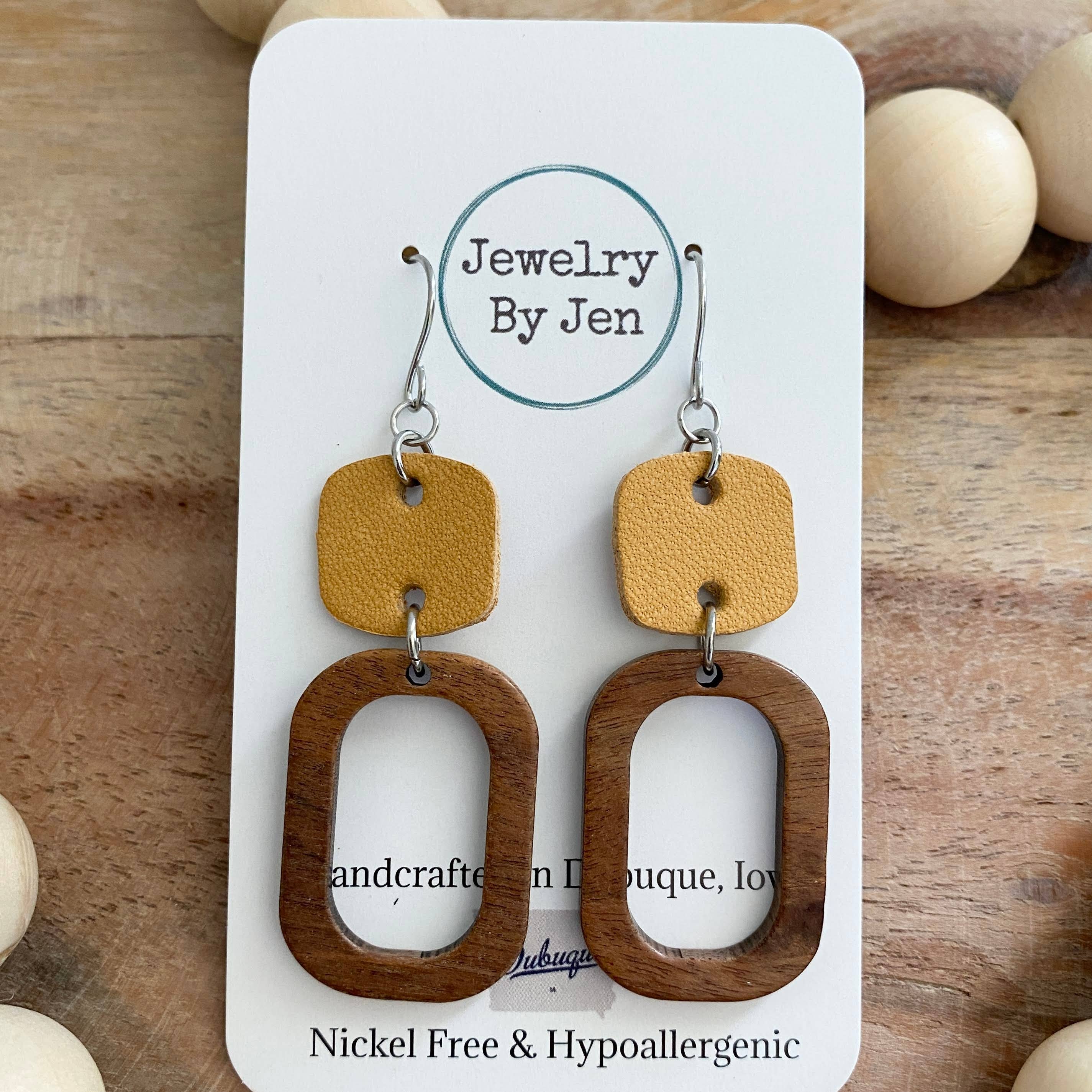 Fun cherry wood hoops with a camel accent. This listing is for one pair of earrings measuring 1.3". Ear hooks add approximately .5 inches in length to the overall design. DETAILS *Genuine Leather *Antique Bronze Nickel-Free Wire *Cherry Wood Hoop *Rubber Backings Included *Earrings are packaged on a lovely display card.