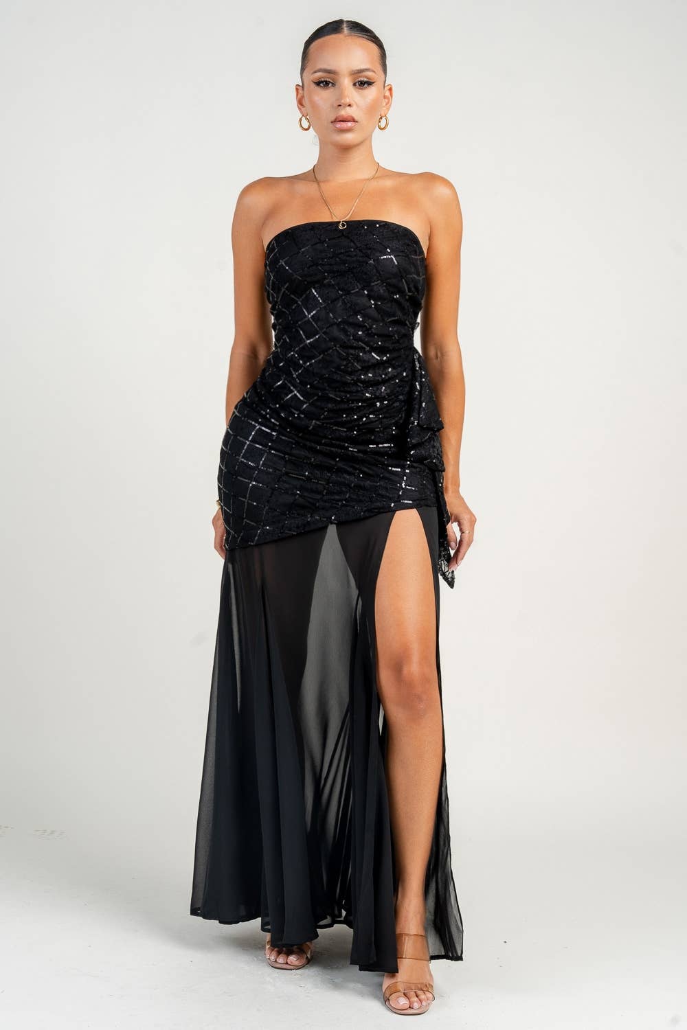Style # BD5286 Turn heads with this stunning Plunge Neck Thigh Split Maxi Dress. Designed for elegance and bold sophistication, this dress features a deep V-neckline that enhances the decolletage and ultra-high thigh splits for a daring yet graceful look. The figure-hugging silhouette flatters every curve, while the lightweight fabric drapes beautifully, making it perfect for nights out, special occasions, or vacations. -Deep plunge V-neckline for a striking silhouette -High thigh splits for a dramatic, flowy effect -Sleeveless design for a sleek, modern touch -Maxi length, perfect for an elegant yet sultry look -Soft, stretchy fabric for all-day comfort sexy maxi dress, thigh split dress, deep V-neck dress, sleeveless maxi dress, formal evening dress, elegant summer dress, vacation dress, figure-hugging long dress, clubwear maxi dress, trendy party dress Model is 5' 9" and wearing a S.