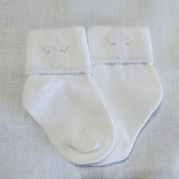 Baby boys or girls white cuff socks with embroidered cross embellishment. These are beautiful socks perfect for baptism, christening, dedication, baby blessing or naming. These make great little church socks as well. 💜 Soft white dress socks embellished with a sweet cross (size-00 and fits 0-6 months) 💜 These are nice quality socks that stay on well and make a great accessory for their special day.