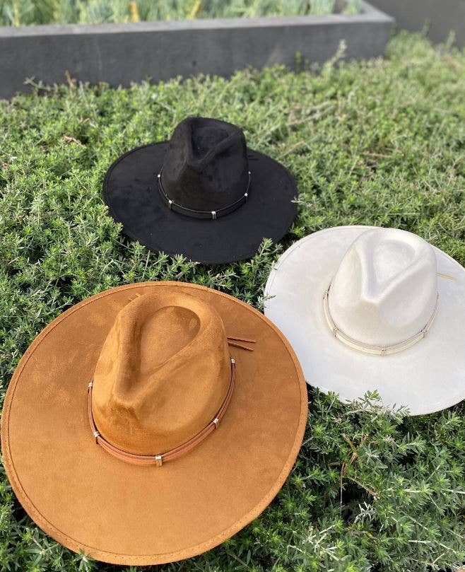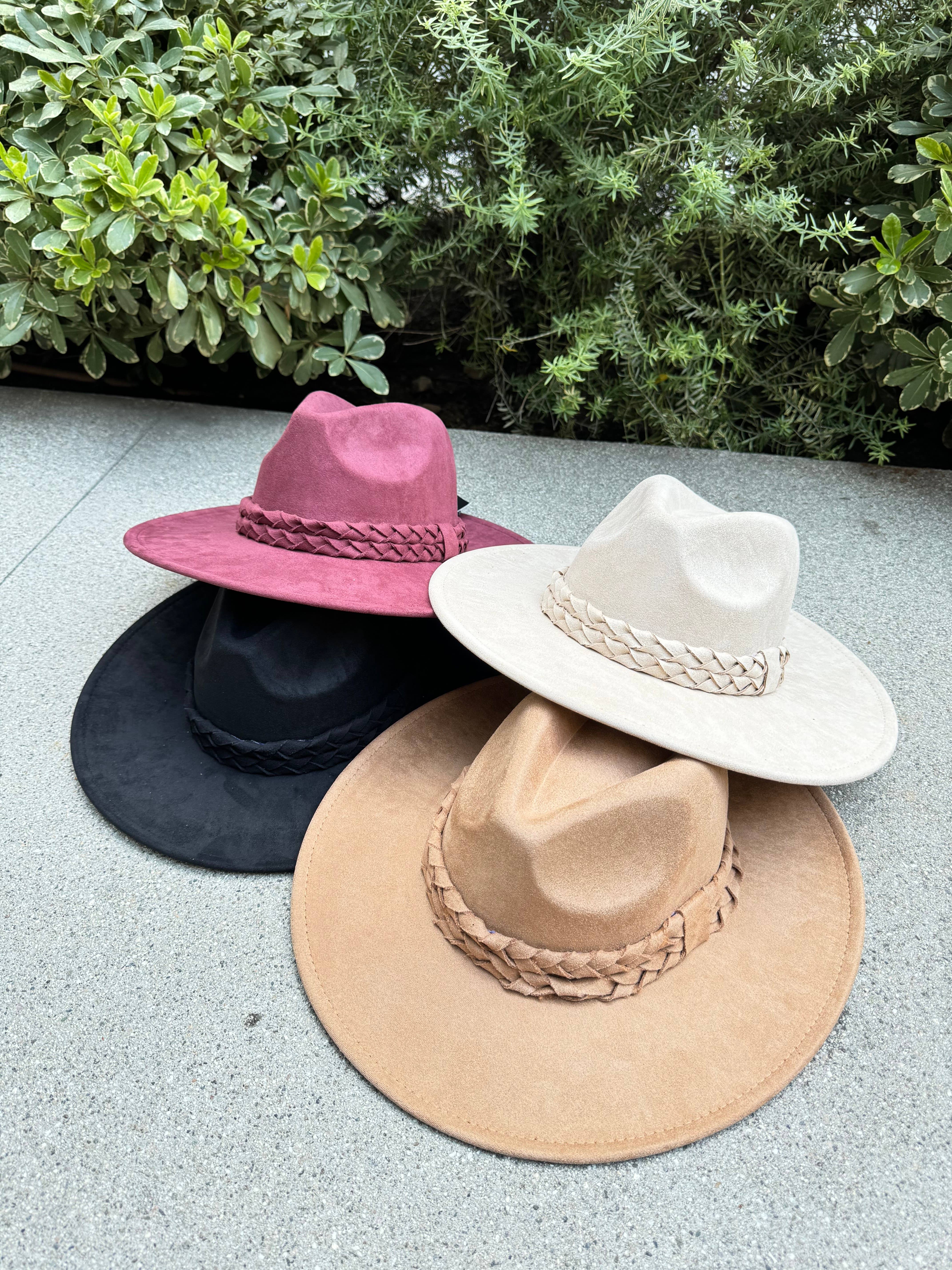 Vegan suede fedora with braided trim. Adjustable inner drawstring Brim: 2.75 in. 100% polyester love and thyme