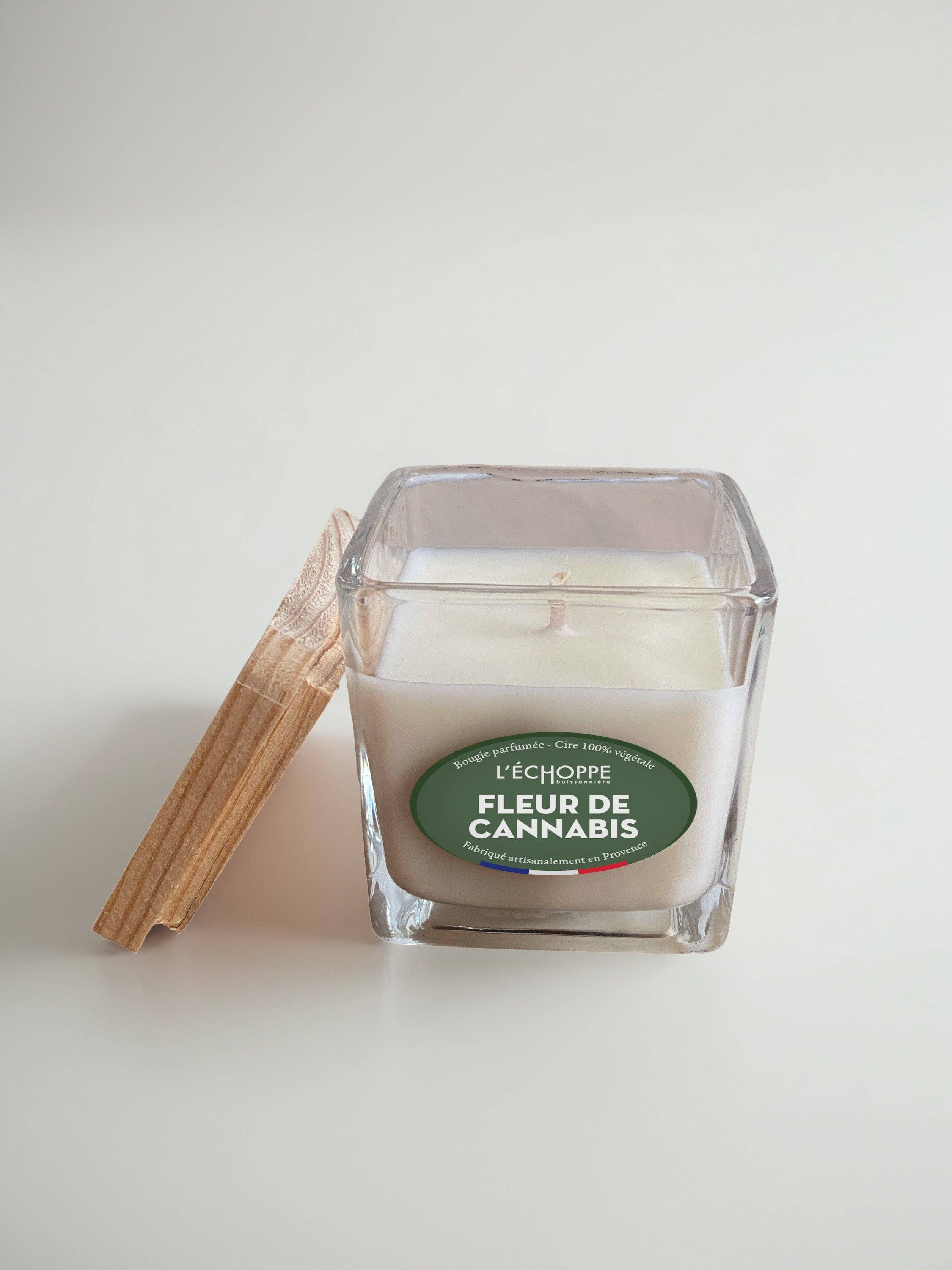 ROUND GLASS JAR + METAL LID Scented candle 100% vegetable soy wax Cotton wick Burn time: 45 h Net weight: 180g Grasse fragrance Handmade in France The Cannabis Flower candle emits a green, herbal, and slightly spicy scent. This modern and bold fragrance evokes raw nature and mystery, perfect for a contemporary and original atmosphere.