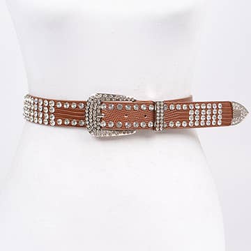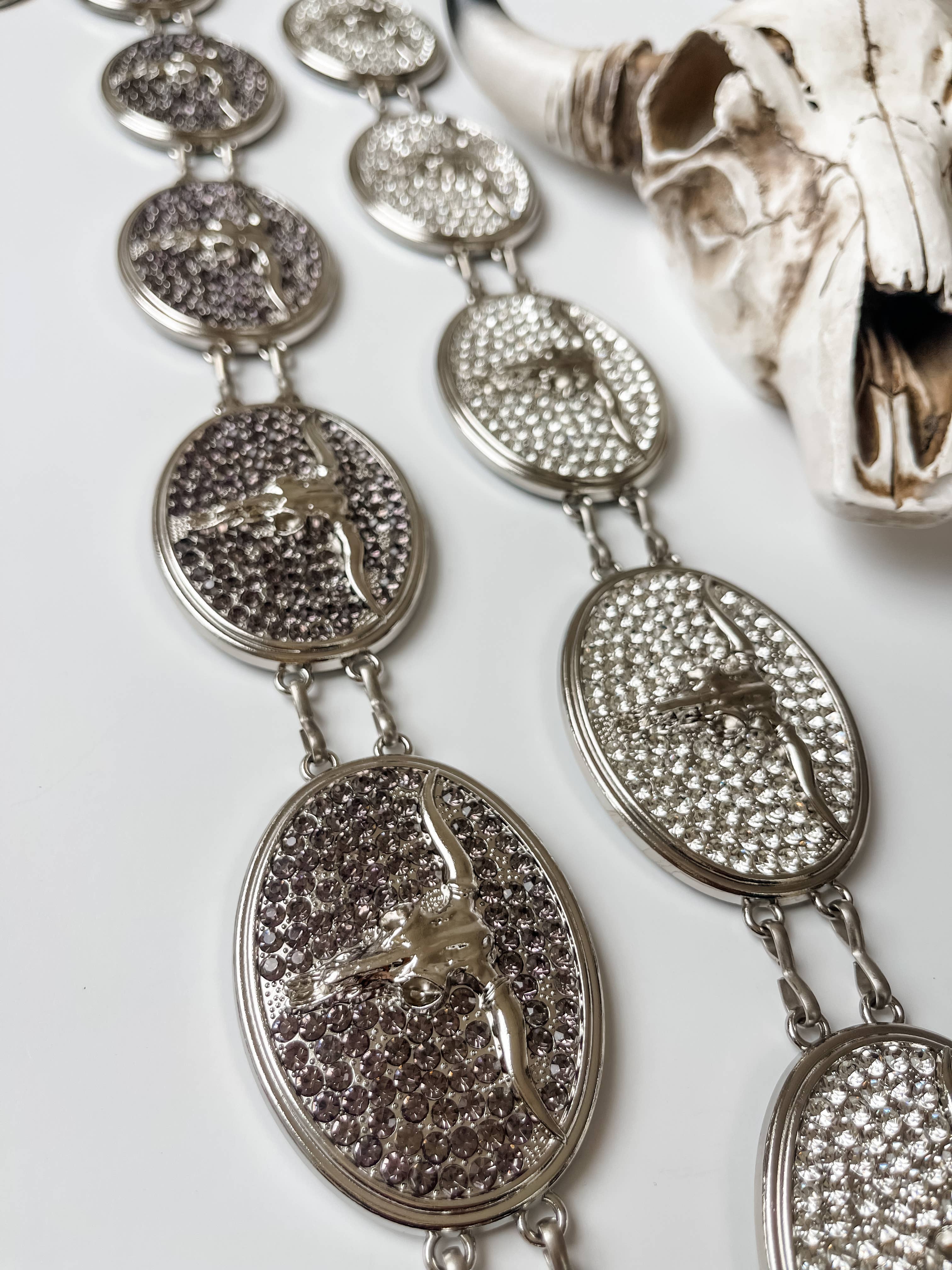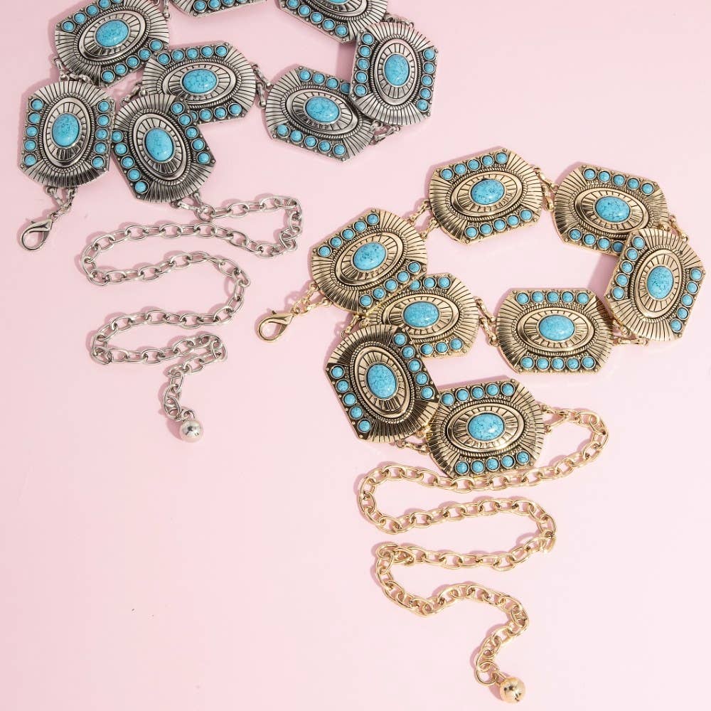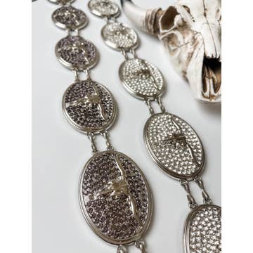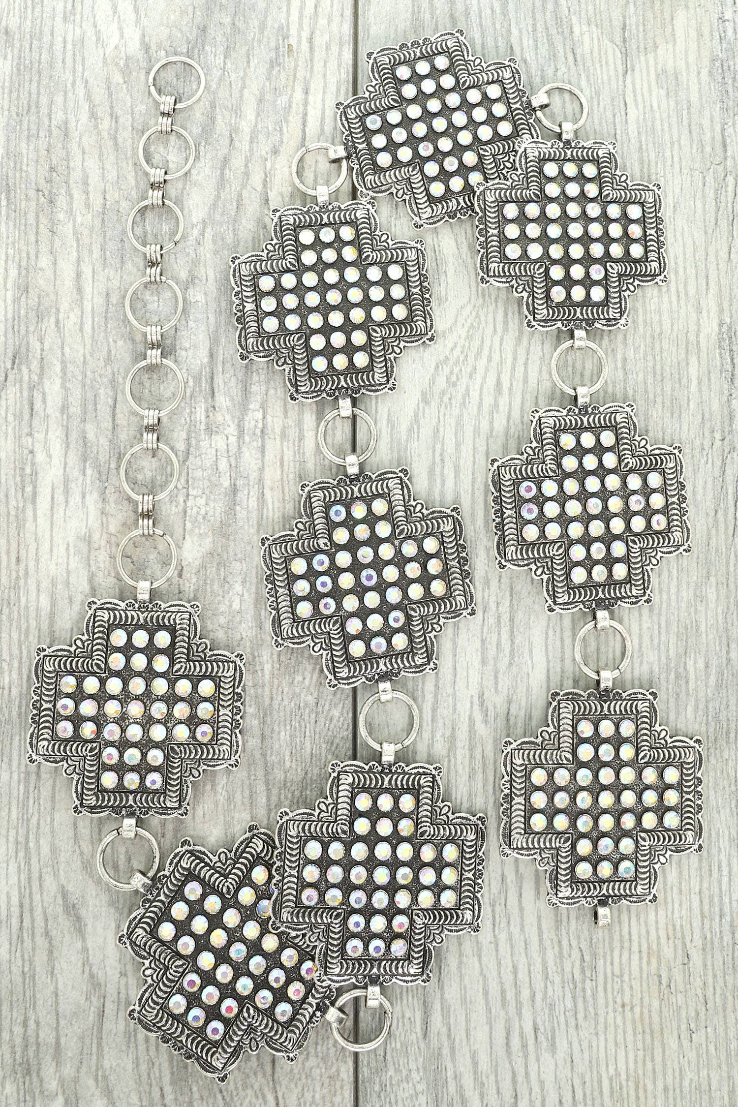 A stylish cowgirl's wardrobe isn't complete without a belt! This bling, fun chain belt is a fantastic addition to your collection of western-style belts that can be matched with many different outfits. Silver chain linking each concho rhinestones decorate each conch Rectangle concho size 2.5" x 2" Round concho 2.5"D Clasp closure 55ā total length