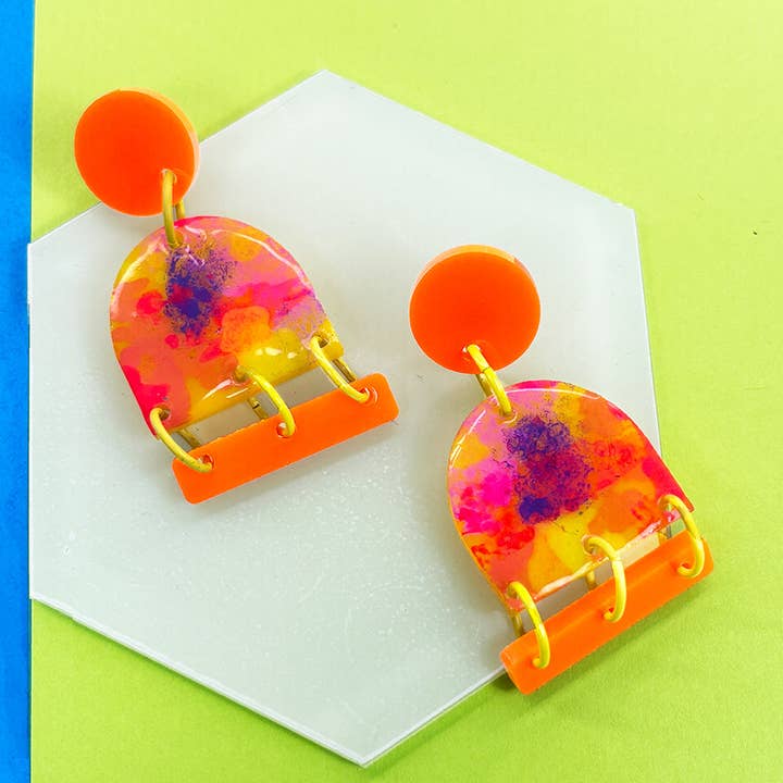 Bring back the groovy style of the 1960s with these Flower Child earrings. These groovy statement earrings are hand painted on acrylic so each pair is unique and will vary slightly from the images shown above. These make a perfect gift for your flower child or groovy bestie. Created with tomato red and mango orange acrylic, the earring dot is 5/8 inch in diameter, the flower hangs 2 1 /2 inches from the dot.