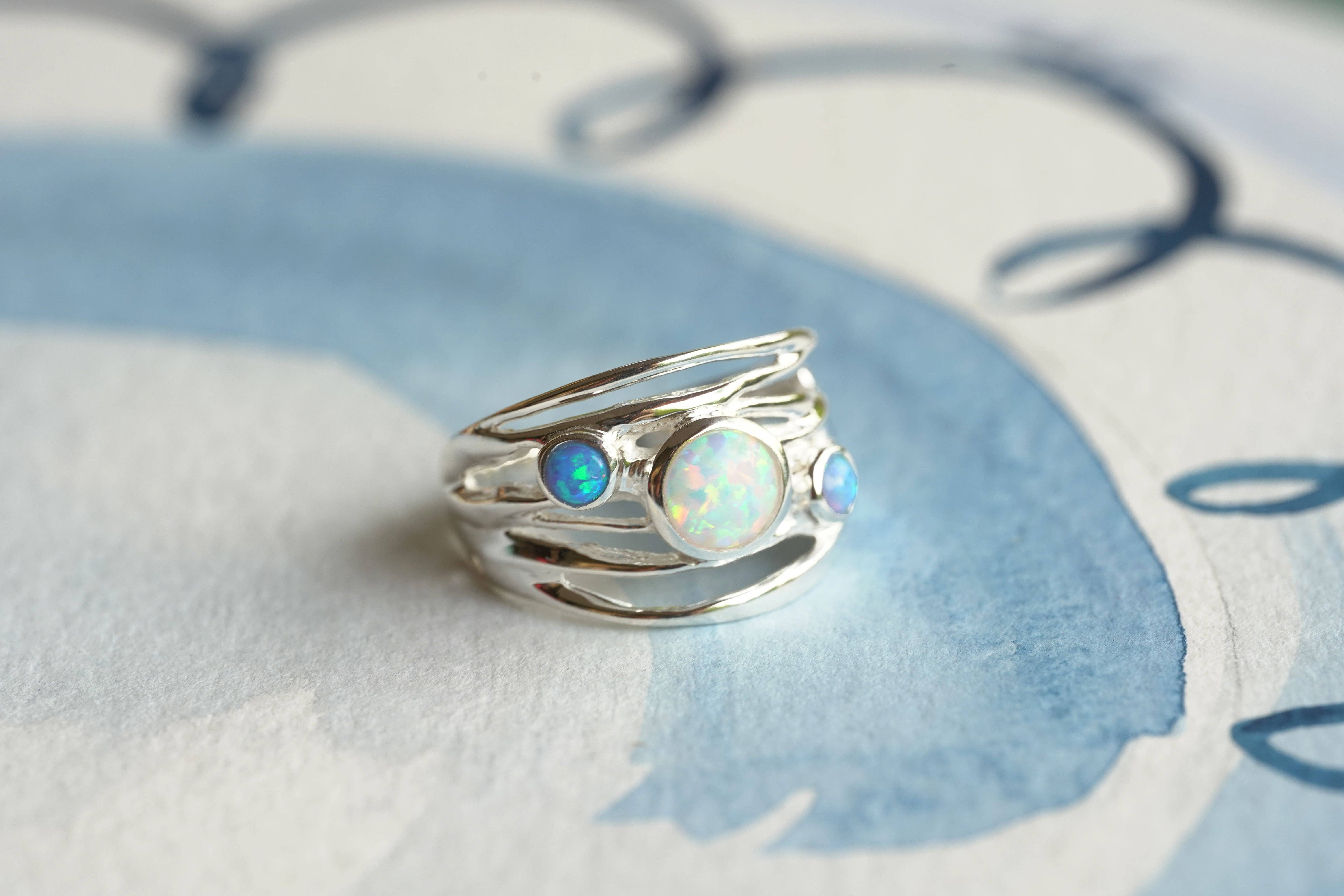 This textured Sterling Silver multi-band ring features three vibrant Opalites in blue, white and pink, and a dainty flower and spiral design. It measures 13mm at its widest point. Materials: Sterling Silver, Opalite