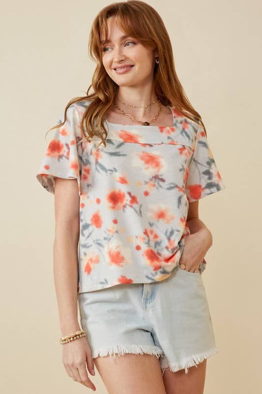 100% POLYESTER DOLMAN SHORT SLEEVE WITH RUFFLED V NECK FLORAL PRINT TOP WITH ROUND HEM DETAIL "MODEL SIZE: HEIGHT 5'6"", BUST 32"", WAIST 24"", HIPS 32"" WEARING SIZE: SMALL" *The garment color may differ slightly upon arrival due to being taken with professional lighting also depending on what device you maybe using to shop*
