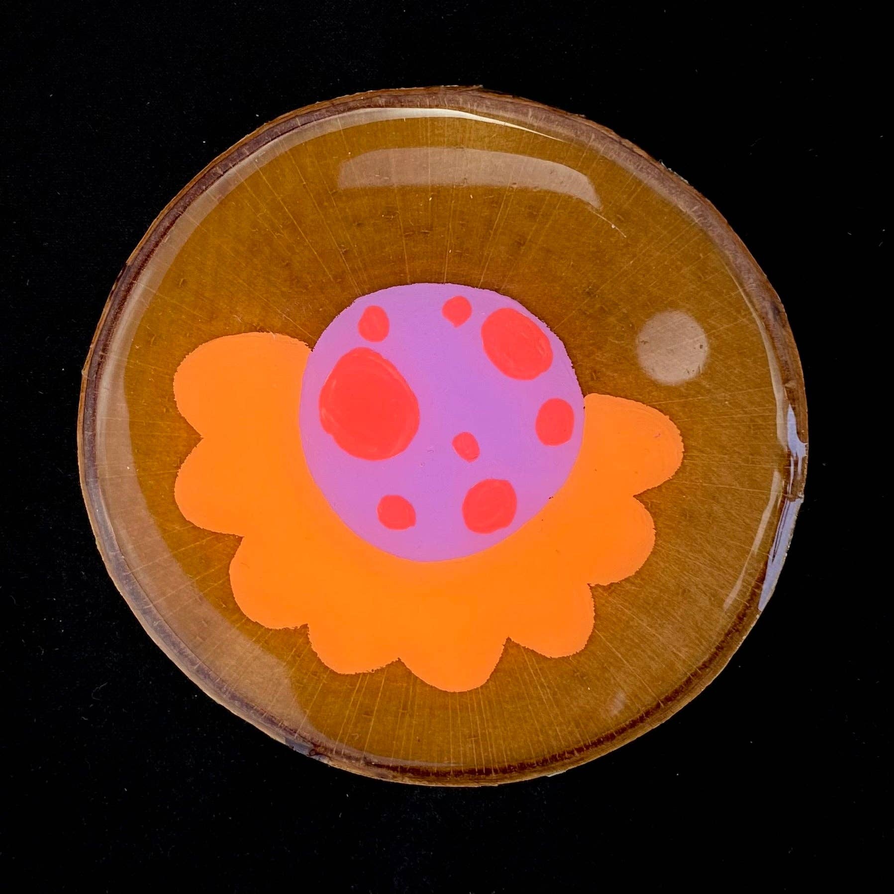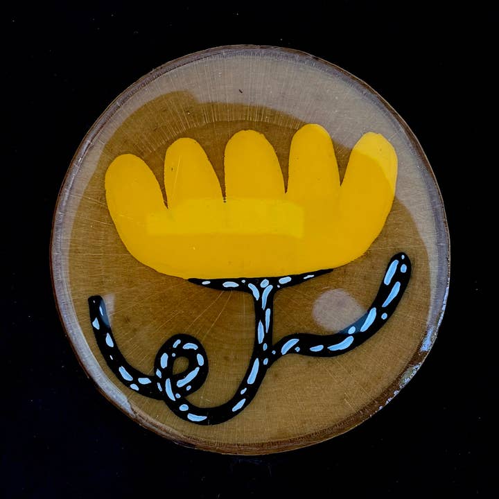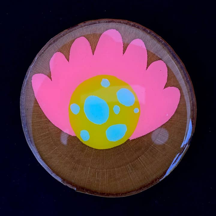 Made from a slice of birch this painted coaster is a stylish and functional addition to the countertop, desk top, or coffee table. Pretty, durable, and one of a kind!! Size: approximately 3.5" diameter x 1/4" tall abstract painting on wood slice. Painted in acrylic and sealed with food safe resin. Your coaster will be chosen at random from the collection of coasters pictured below.