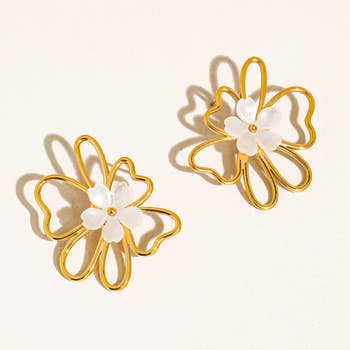 SKU: E-51 Color: White and Yellow Gold Is Set: Set Material: Gold Plated, Stainless Steel, and Stone Occasion: New Year's and Valentine's Day Stone Type: Pearl Style: Whimsical Theme: Nature Weight: 8.5 g (0.3 oz) UPC: 718852329971