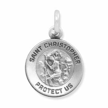 St. Christopher - Patron Saint of Travelers The story of St. Christopher tells how he was preparing to cross a river when a boy approached him, asking the saint to help him across. Christopher picked him up and put him on his shoulder so that the child wouldn't get wet. As they crossed, the saint felt the weight of the child getting heavier with each passing step. When they reached the dry land once again, the child revealed himself to be the boy Jesus come to earth to test his faithful disciple. Pleased with Christopher's act, he blessed the Saint, and told him that the weight he felt was the burden God carried. The weight of the whole world. St. Christopher protects travelers who carry his image, and it's said that he wards off storms and plagues.