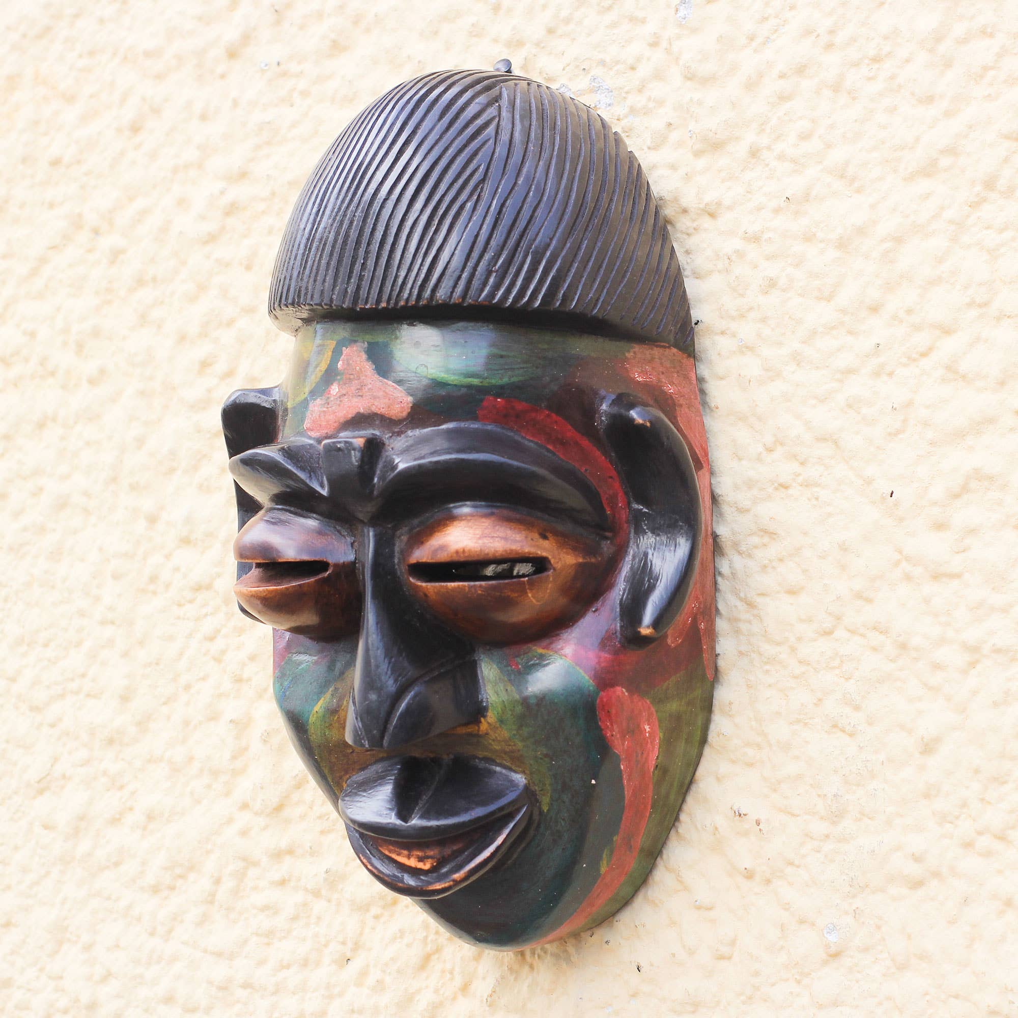 The plaster Lion Face Cutout Wall Plaque is a stunning decor piece that features a striking lion face design with intricate details that will captivate your guests. Has a metal wire hook for easy hanging. Material: Plaster Color: Stone Wash - (beige and black weathered paint wash) - since each piece is finished by hand, colors may vary slightly Dimensions: 4"L x 5.3"W x 1.3" H Made in the U.S.A.