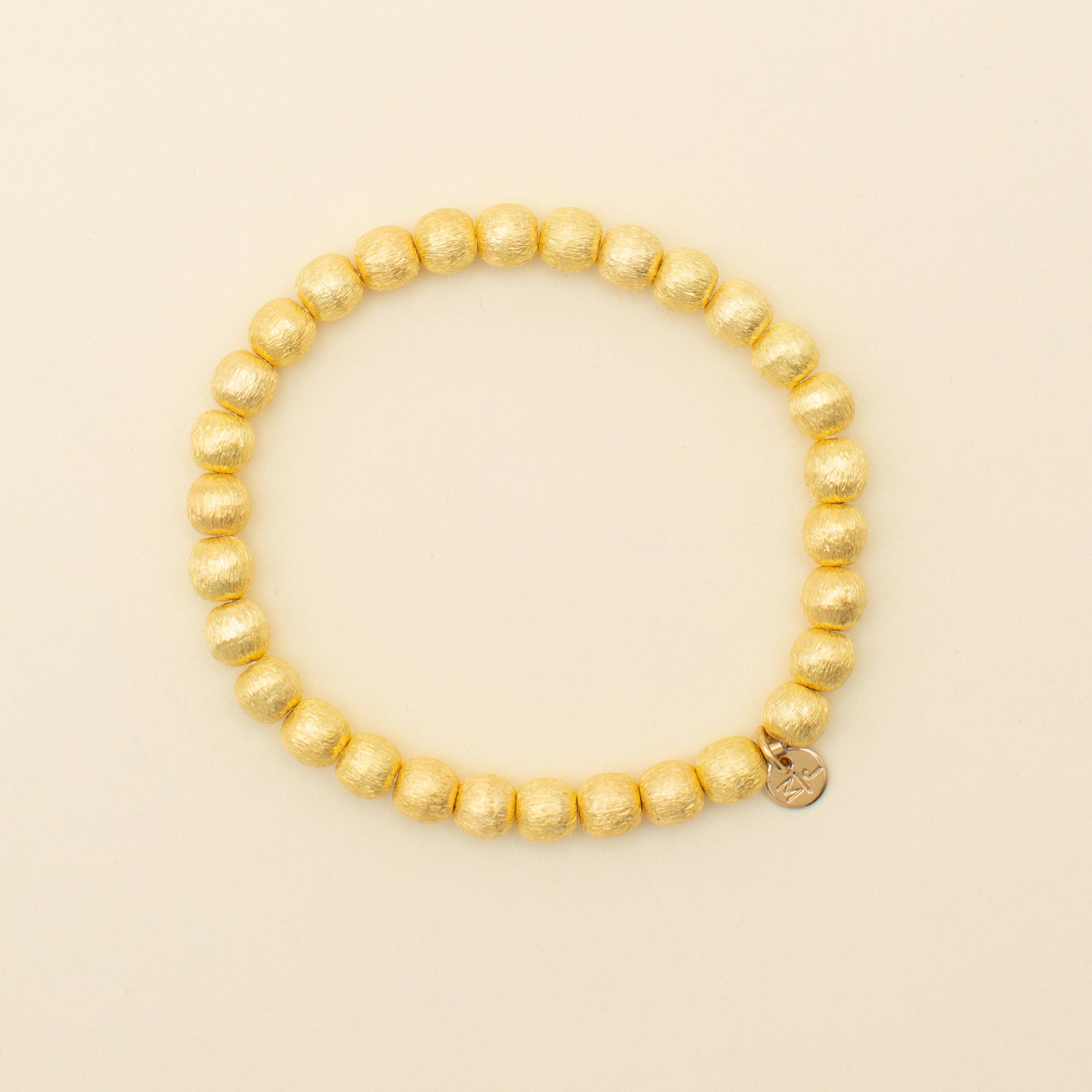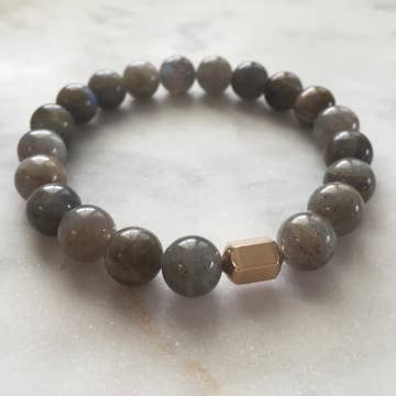 * 6mm labradorite stones * 6 3/4" unstretched * 22k gold plated bead centerpiece * Strung on strong elastic cord for easy on and off wear * Wear alone or add to your stack