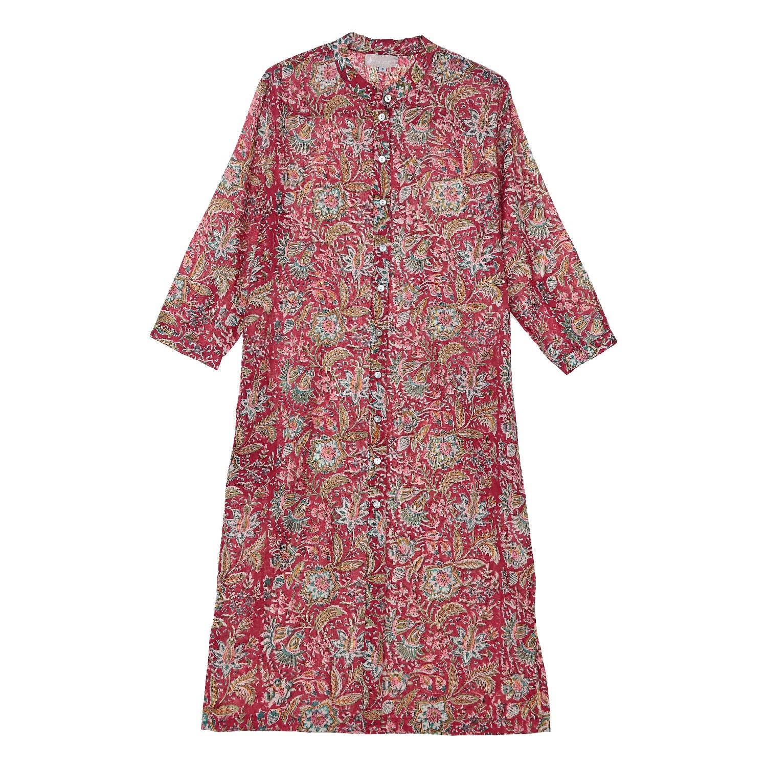Long shirt dress with mandarin collar, long sleeves, and side pockets.