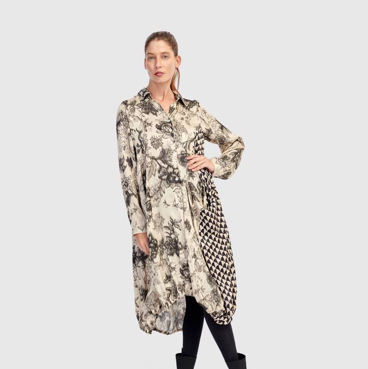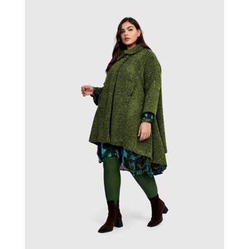 Fit & Sizing * Loose from shoulders to hem * If between sizes, we recommend sizing down * Yanka is 5'9" & wears Alembika 0/XS (US 4-6) Materials & Care * 50% Polyester + 20% Wool + 15% Cotton + 15% Acrylic * Cozy brushed knit with quilted sleeves; due to the nature of this fabric we recommend a layer for those with sensitive skin Product Details * Boxy silhouette * Maxi length * Loose drop shoulder bracelet sleeve * Full button placket * Oversized patch front pockets, side slits, unlined * Style: UJ645K This modern maxi coat delivers comfort and character with a brushed khaki knit and quilted sleeves for textural contrast. Designed with a loose, boxy fit and deep side slits, it layers effortlessly over casual and dressy looks alike. Oversized pockets and a full placket complete the utilitarian edge.