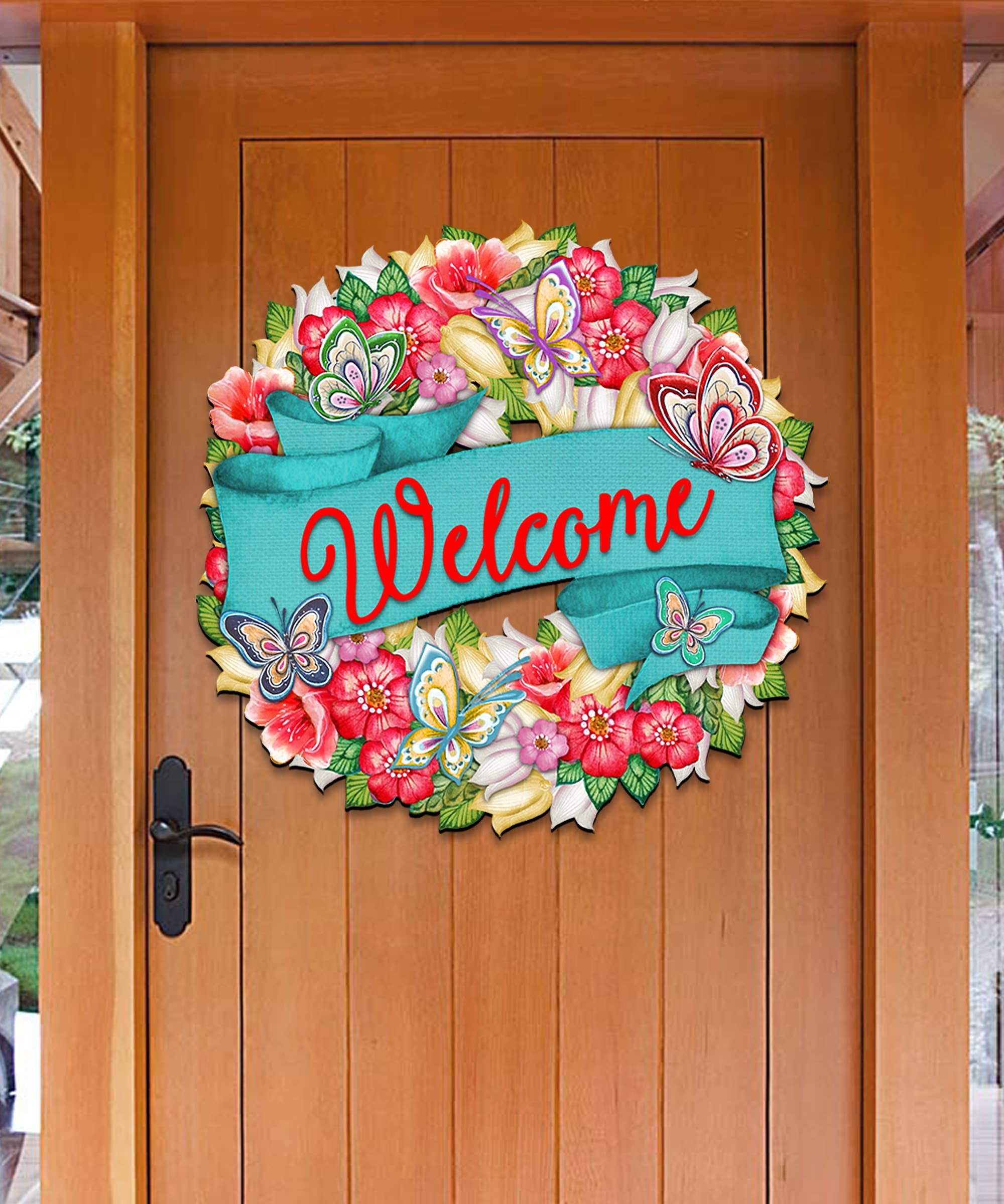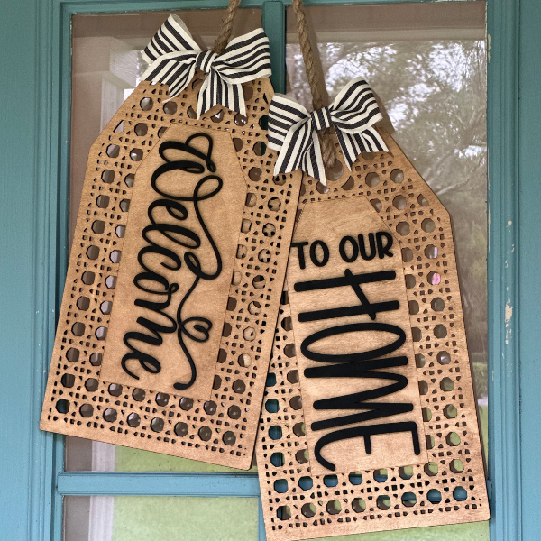 Accent your front door with the cutest door-hanger Laser cut Approximately 13.5”x 15" You can choose if you want it cut out of 1/8" MDF(painting only) or 1/4" wood(good for staining) with overlays. purchased as a DIY Kit DIY Kits come unpainted, unassembled, wrapped. Wood pieces only. A hole will be drilled at the top so your customer can add ribbon or string of their choosing. Ribbon or string not provided. Mdf is good for painting. Wood is good for staining. Sample pictures are out of 1/4” wood.