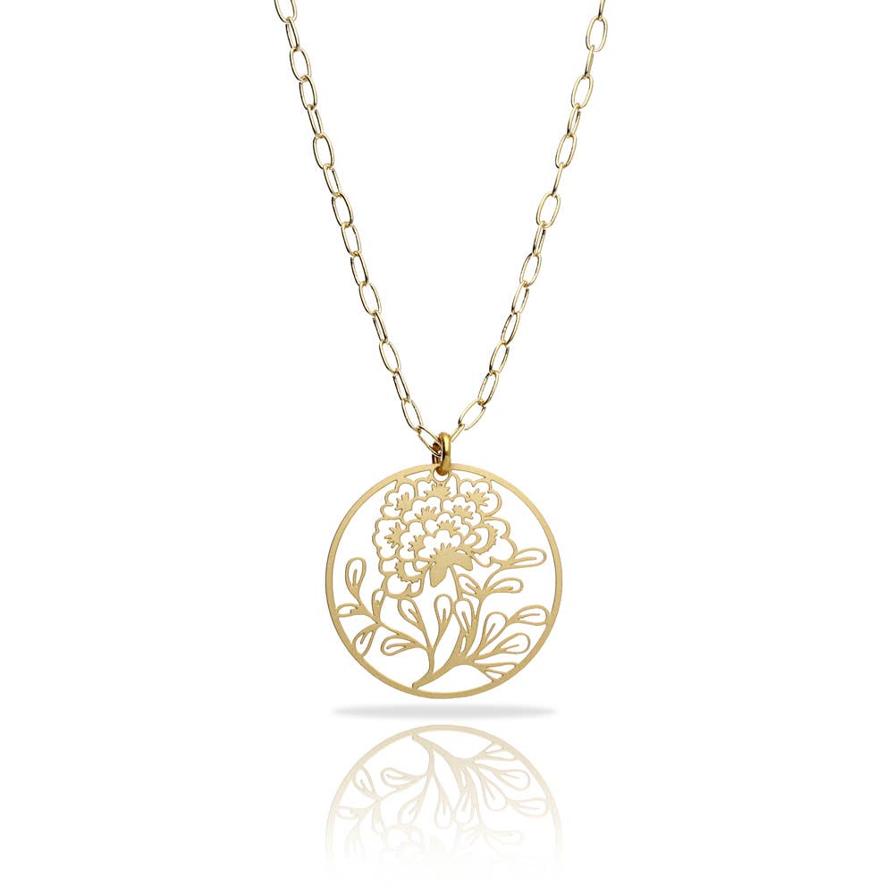 Pendant | Porcelana Flor Collection Materials: Brass | Uneven finish | Gold plated | Layer of lacquer | Plated and passivated brass chain Approximate size: 3.6 x 3.6 cm| Chain 39 cm + 5 cm extension Incluyed a gift bag Designed by RAS®