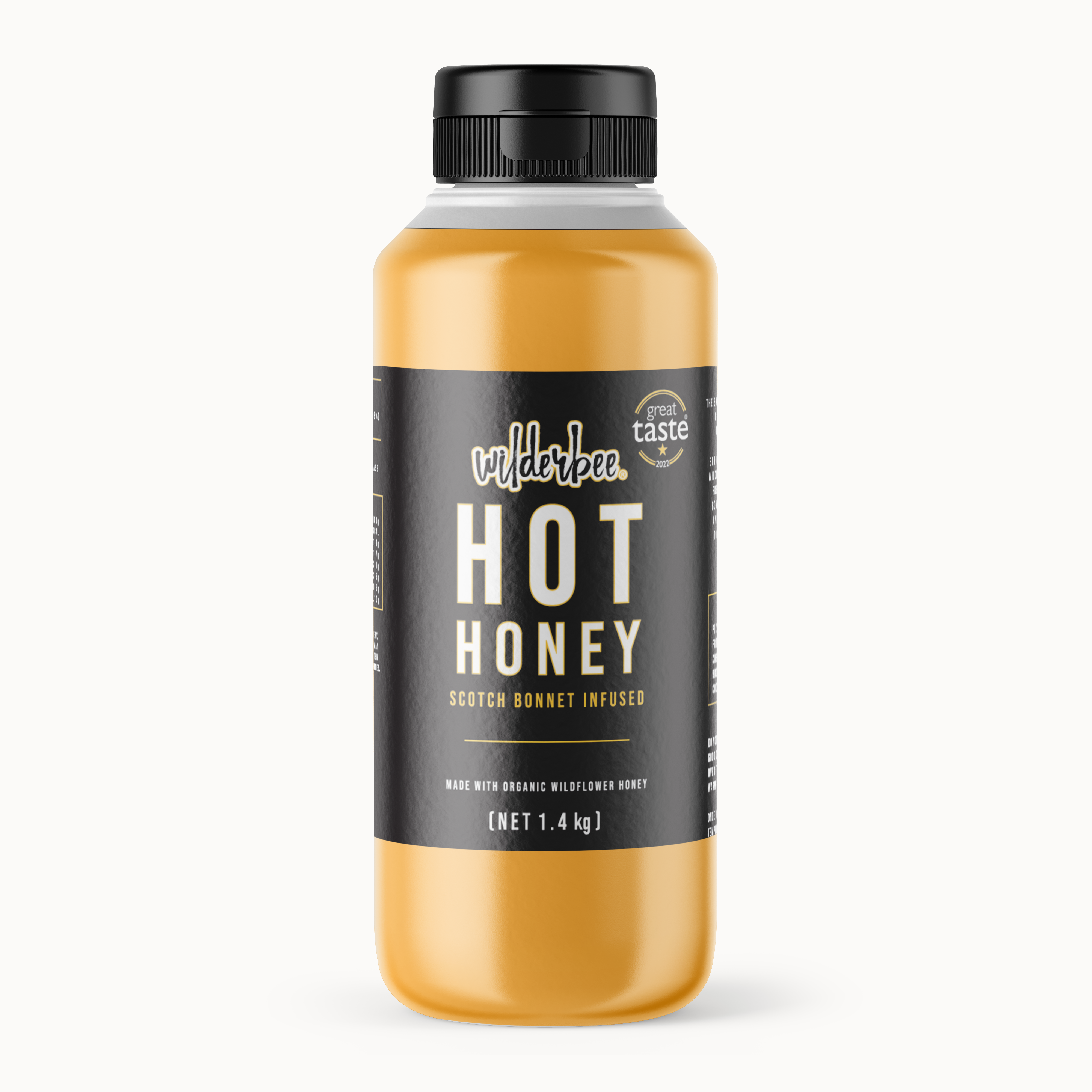 Our 2023 Great Taste Award Winning Gochujang Hot Honey. 1.4kg squeezy catering bottle. Ideal for busy kitchens, food trucks, pop ups, and catering events. Or if you just can’t get enough of the sweet heat and just need a bigger bottle in your life! Produced with an ethically farmed, bee-friendly, wildflower honey, and infused with a fruity, fiery blend of sustainably grown fresh scotch bonnet chillies - combined with a traditional fermented Korean Gochujang for a sweet, spicy, umami kick that you’ll want to drizzle on your wings, BBQ, fried chicken, tacos, pizza, cheese.. EVERYTHING!
