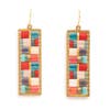 These handmade beaded earrings feature premium Japanese glass Miyuki beads which are woven on a stunning brass earring component. Inspired by the beautiful colors found in the deserts of the Southwest, these statement earrings combine a bold geometric design with accents of black and white for contrast. Each strand of hand strung fringe is adorned with a tubular and a gold drop bead. The brass component is attached to a stainless steel ball post. Our earrings are handwoven by women artisans from vulnerable communities in Medellin, Colombia who receive fair working conditions and compensation for their skills as is detailed on our earring cards. Materials Brass Component Miyuki Glass Beads Stainless Steel Ball Post Dimensions Length 3 Inches Width 1.5 Inches *This style is available in several colorways. The photos and videos of the earrings being modeled are included for size reference. ** The last photos are added to show our earring cards and in-store merchandising ideas.