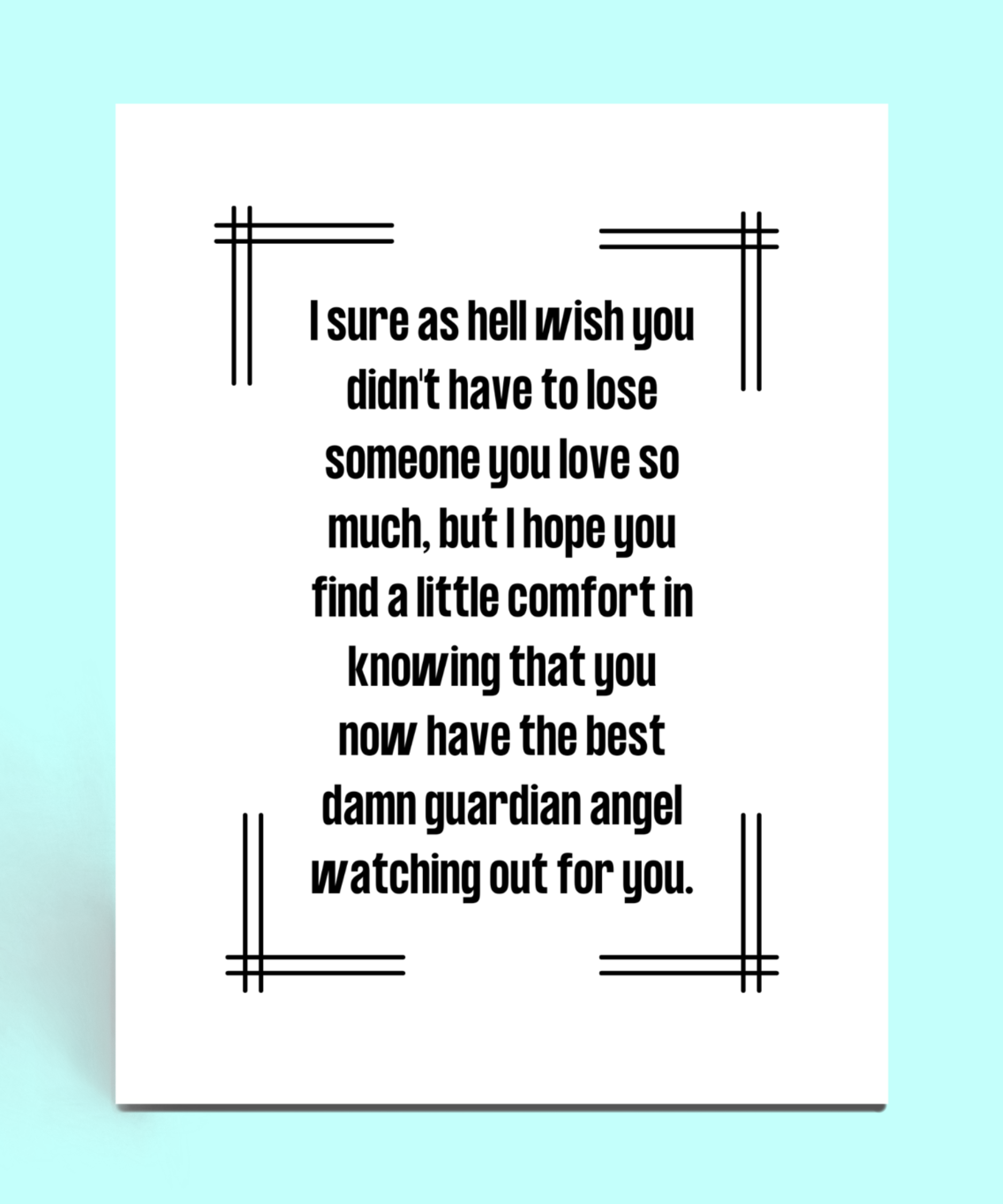 Pet loss just fucking blows. When you're not sure what to say, send this to your friend who just lost their loyal companion. They'll love you for your support. * 4.25 x 5.5" card * Blank inside (I wouldn't want to steal your thunder!) * Printed on sturdy, semigloss cardstock * Comes with a brightly-colored self-sealing envelope!