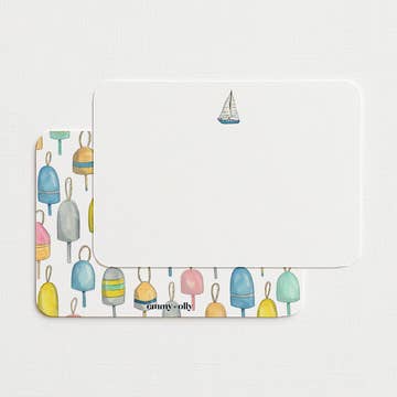 Bring the charm of the New England dockside to everyday correspondence with this set of eight 5 x 7-inch cards. The front, framed by a butter-yellow border and accented with a cute sea gull at the top, offers ample writing space for messages. And the fully illustrated back, featuring rows of vintage hand-painted buoys in beautiful sea-worn colors, delights both the writer and the recipient. Paired with matching white Euro-flap envelopes and packaged in a chic clear box with label highlighting contents, this set blends functionality with an ode to the sea and the lobstermen who work on it. A standout choice for Maine and New England gift shops, stationery boutiques, and seaside retailers. Product Details: – Set of 8 flat note cards with illustrated backs – Card size: 5 x 7 inches (A7) – Printed on premium paper with smooth writing texture – Includes 8 white Euro-flap envelopes – Packaged in a clear, retail-ready box About the brand: Independent Puppy creates illustrated goods that blend coastal character with everyday function—all painted, designed, and produced sustainably in the USA by Maine artist Katherine Messenger.