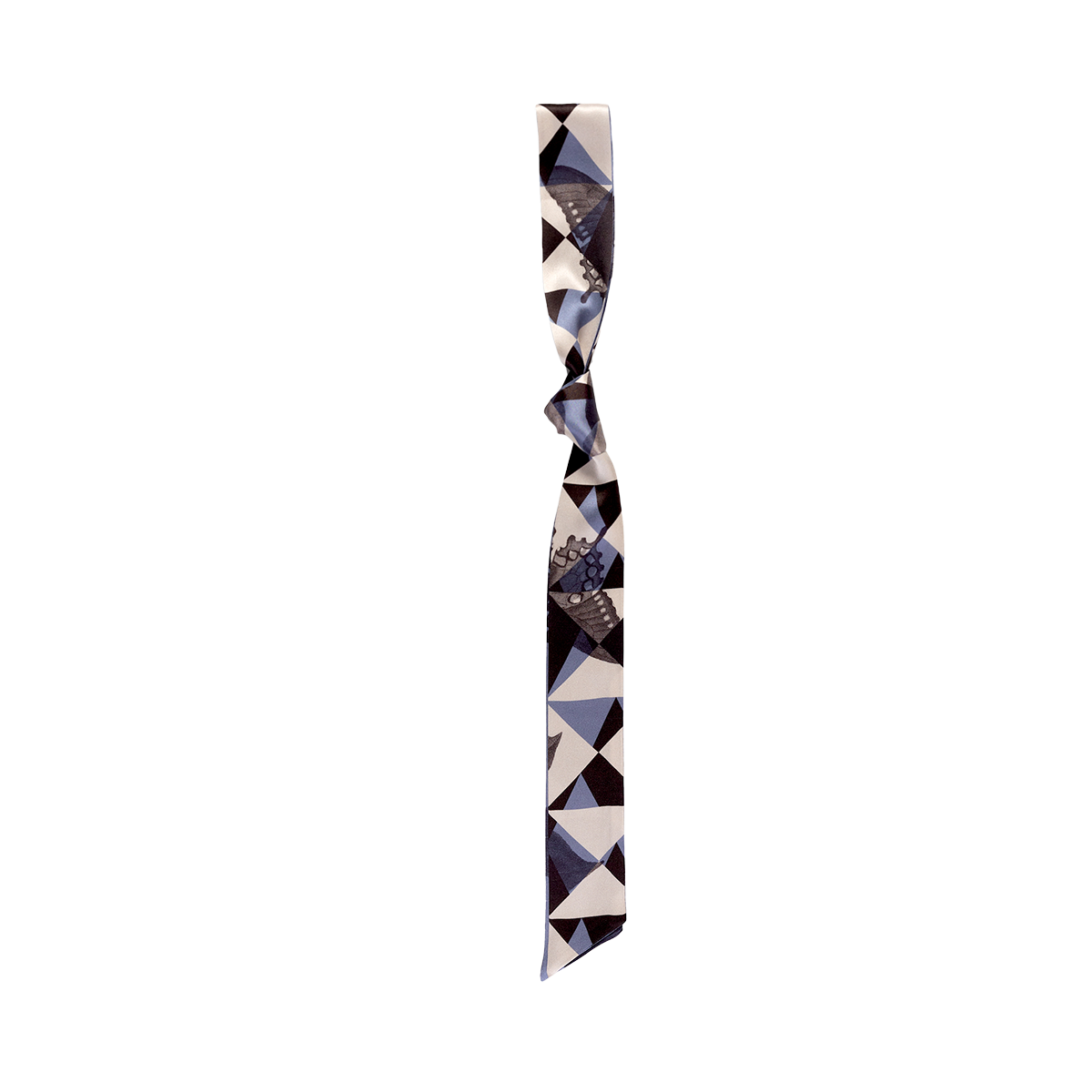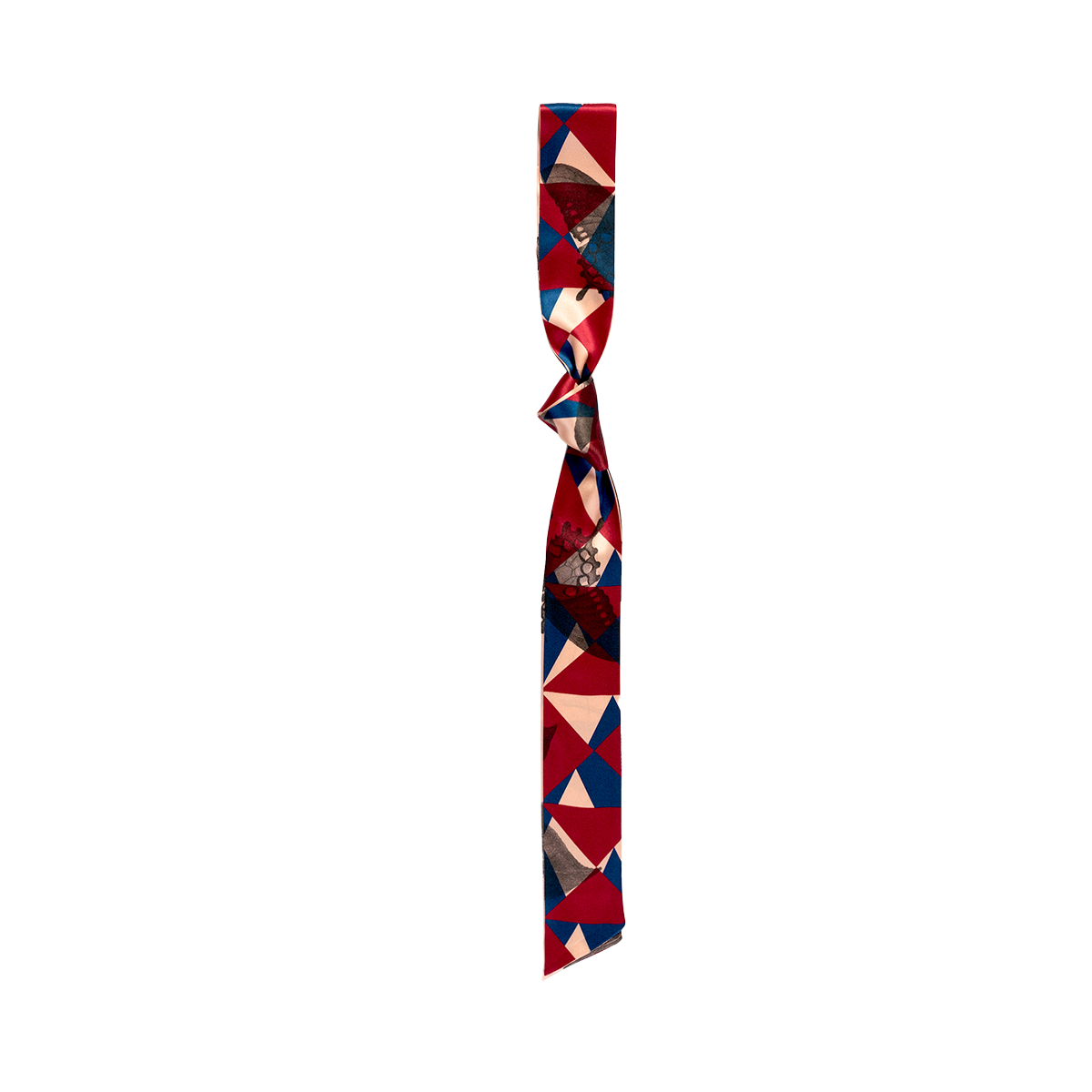The skinny scarf is a unique twist of subtle style that compliments any look. The patterns are geometric prisms with a hint of femininity peeking through with the lace butterfly. This style marries the masculine necktie with the feminine scarf for a neutral tone. The Blue gives the cool, laid-back feel, while the Crimson is a power statement that wants to be noticed. Product Description: * 100% silk satin * 140cm x 5cm ( 2"W x 55"L ) * Different prints on each side * 2 color options: Blue and Crimson How to Wear a Silk Skinny Scarf: * As a scarf: wear it around the neck. You can tie a bow or let the end hang loose. * As an accessory to a top: wear under a collared shirt * As a vest: loosely worn over the shoulders, framing a top or jacket * As a hair accessory: woven into a braid or over a low ponytail * As a bag accessory: Around your purse for a pop of color * As a belt: for a high waisted look over a dress or with pants * Style it any way you want in your own mood and creativity!