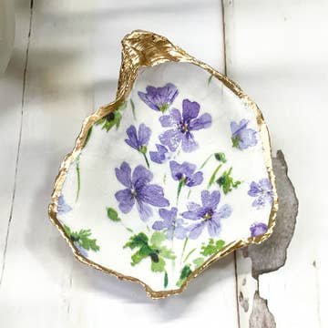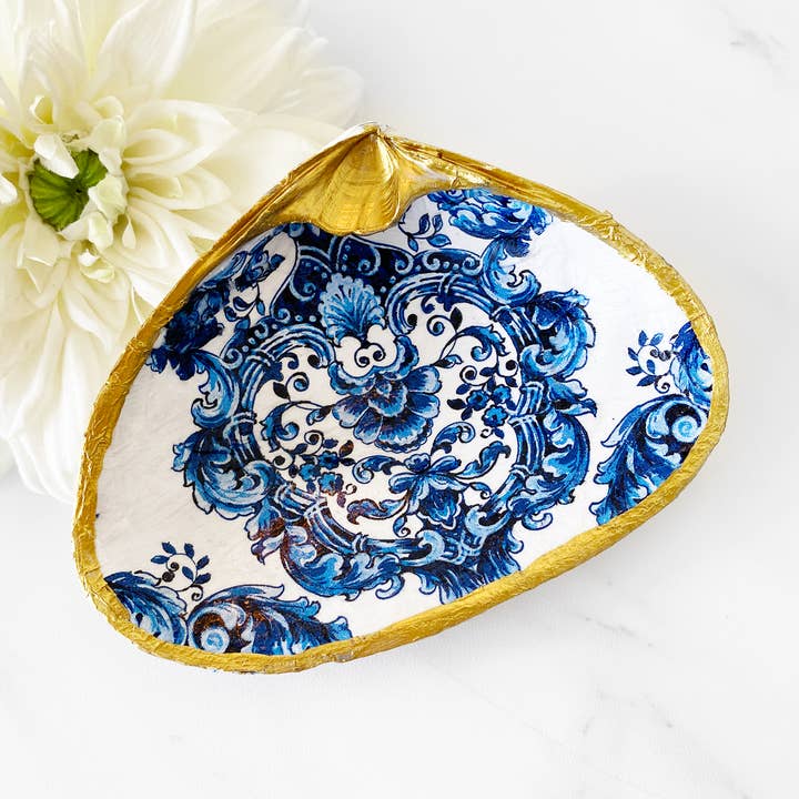 Adorned with a vibrant and realistic daffodil flowers, this clam shell jewelry dish captures the beauty and spirit of spring. Clam shell trinket dish is made from recycled clam shells to fit rings or small jewelry pieces. Also a great wedding gift, birthday gift, or gift for someone special! This decoupage clam shell is gilded with gold edges. The back of the shell has been left natural, highlighting the unique character and natural beauty of the clam shell. Recycled shells are one-of-a-kind creations. No two shells are alike! Each shell has its own unique shape and size. Size, shape, and design placement will vary for each individual shell. Approximate clam shell size: 4-5 in in width.