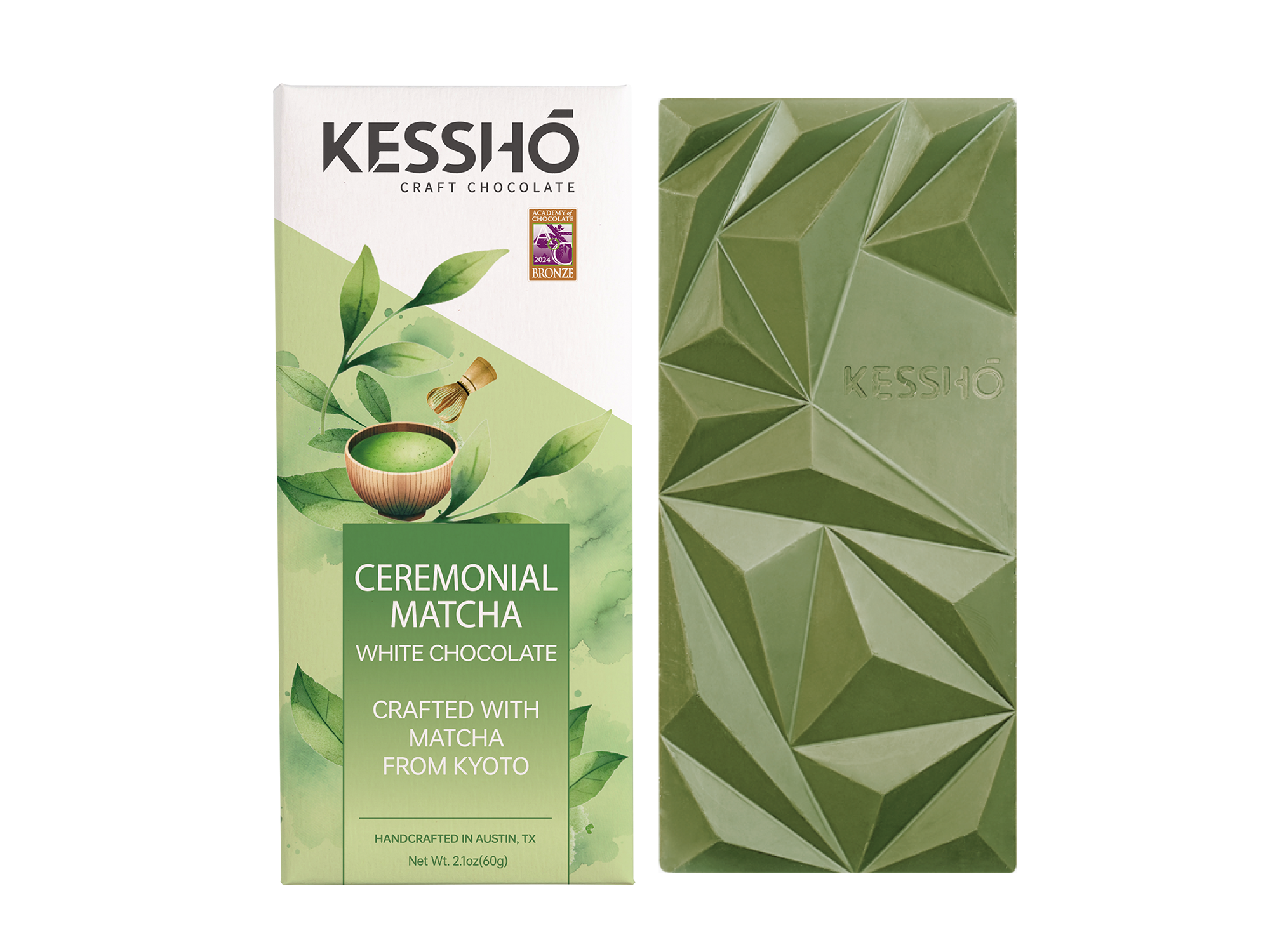 Japanese Ceremonial Matcha White Chocolate Bar – Bronze award-winning. Made with Uji matcha and organic Peruvian cocoa butter, inspired by the delicate flavors found in traditional Japanese snacks. Captures the essence of Japanese tea culture. Cocoa Butter Origin:Peru Tasting notes: Classic matcha, a hint of seaweed, and toasted rice Matcha lovers, we understand your cravings. This bar combines Ceremonial matcha powder from Uji, Japan with organic Peruvian cocoa butter, offering the distinct taste of classic matcha. Hints of seaweed and toasted rice provide a balanced, aromatic flavor. This matcha white chocolate captures the essence of Japanese tea ceremonies, delivering a unique taste journey. Ingredients: Organic cocoa butter, sugar, whole milk powder, skim milk powder, ceremonial matcha powder Weight: 2.1oz(60g) Allergens: Contains milk. Made in a facility that also processes tree nuts, wheat, sesame and egg. Handcrafted in Austin, Texas, USA