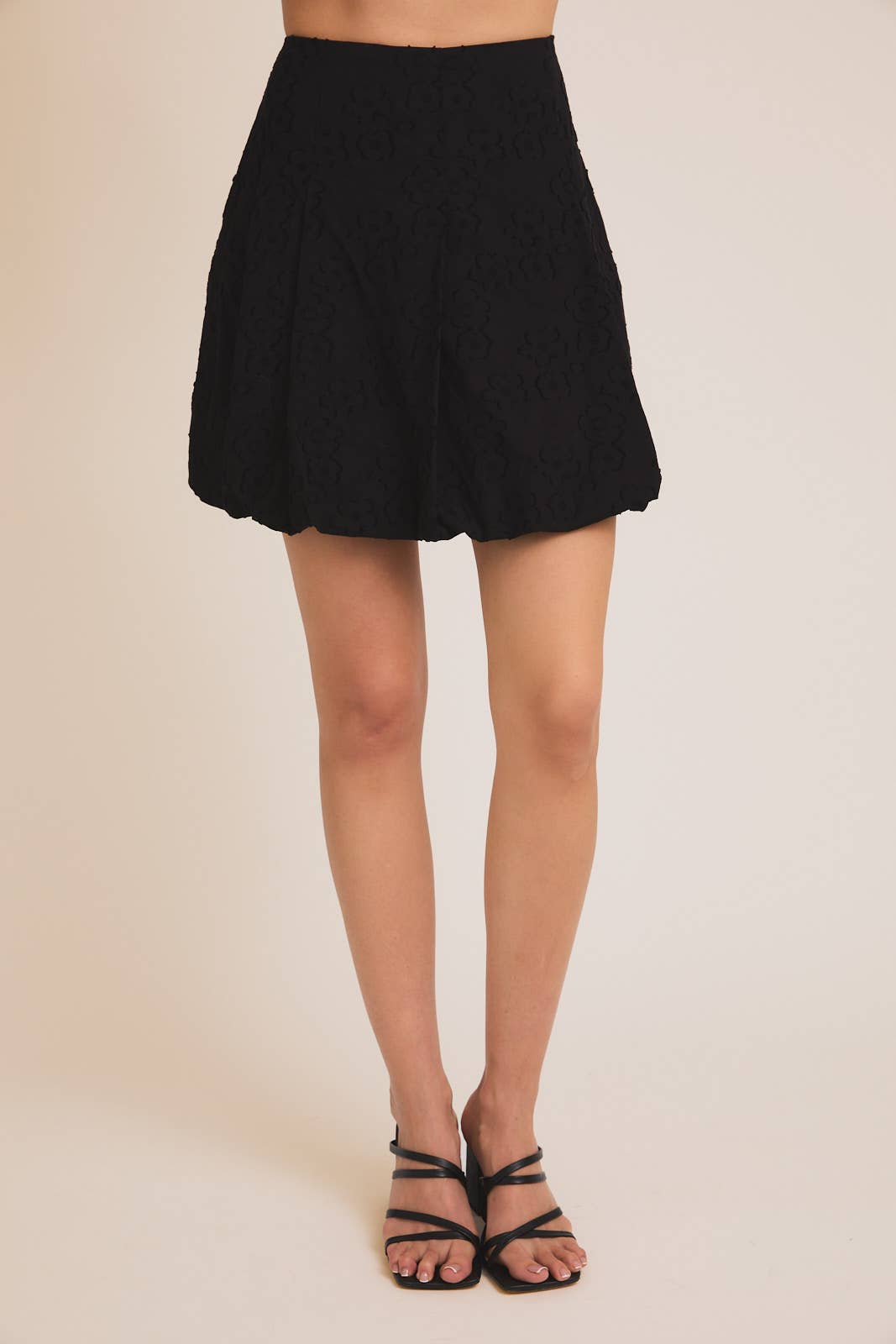 A bubble mini skirt with the following features: Floral-pattern burnout mesh fabric. Elastic waist. Bubble hem. High waist. Lined. Thigh length. Relaxed fit. Model Info: Height: 5 ft 9 in | Bust: 34 in | Waist: 24 in | Hips: 34 in | Wearing Size S.
