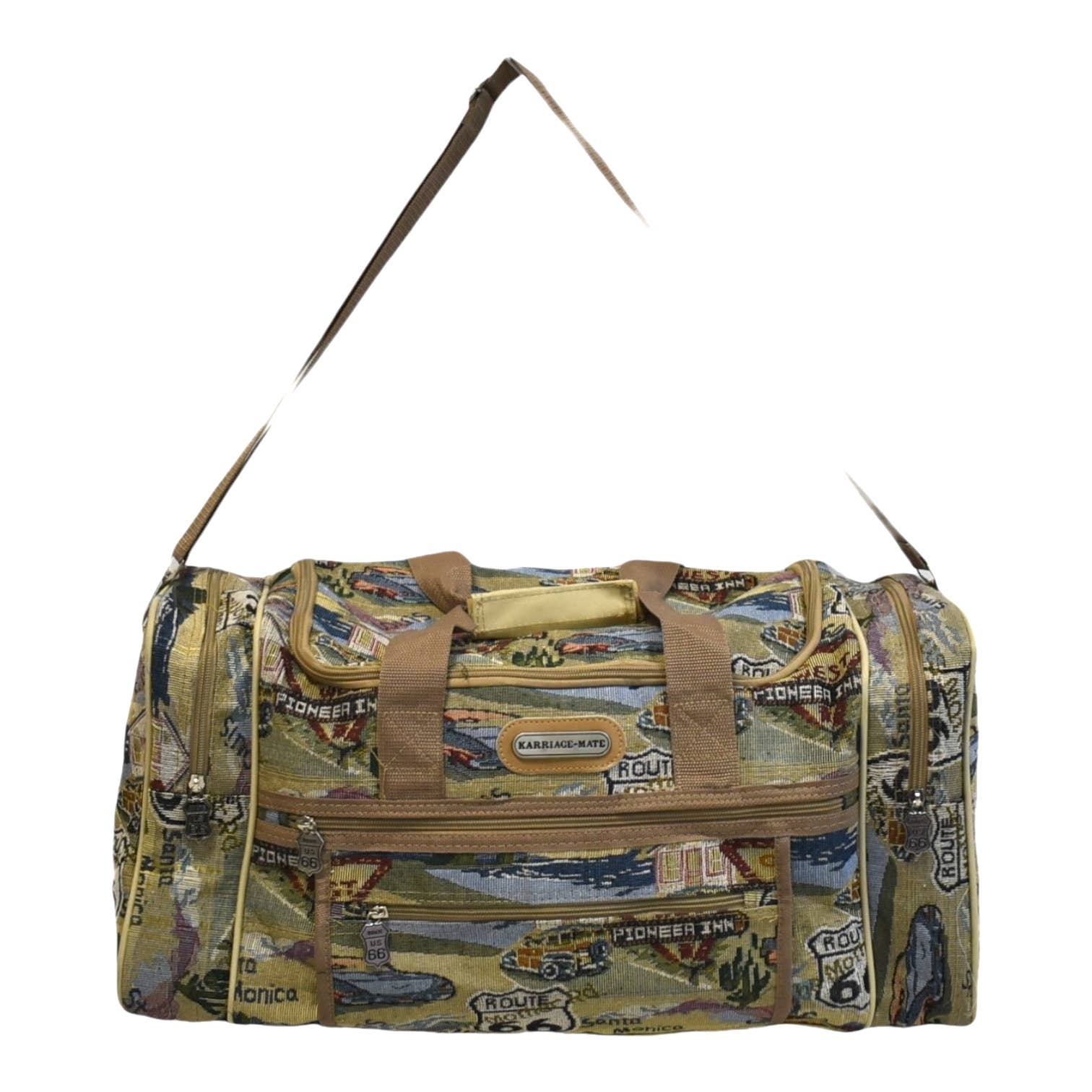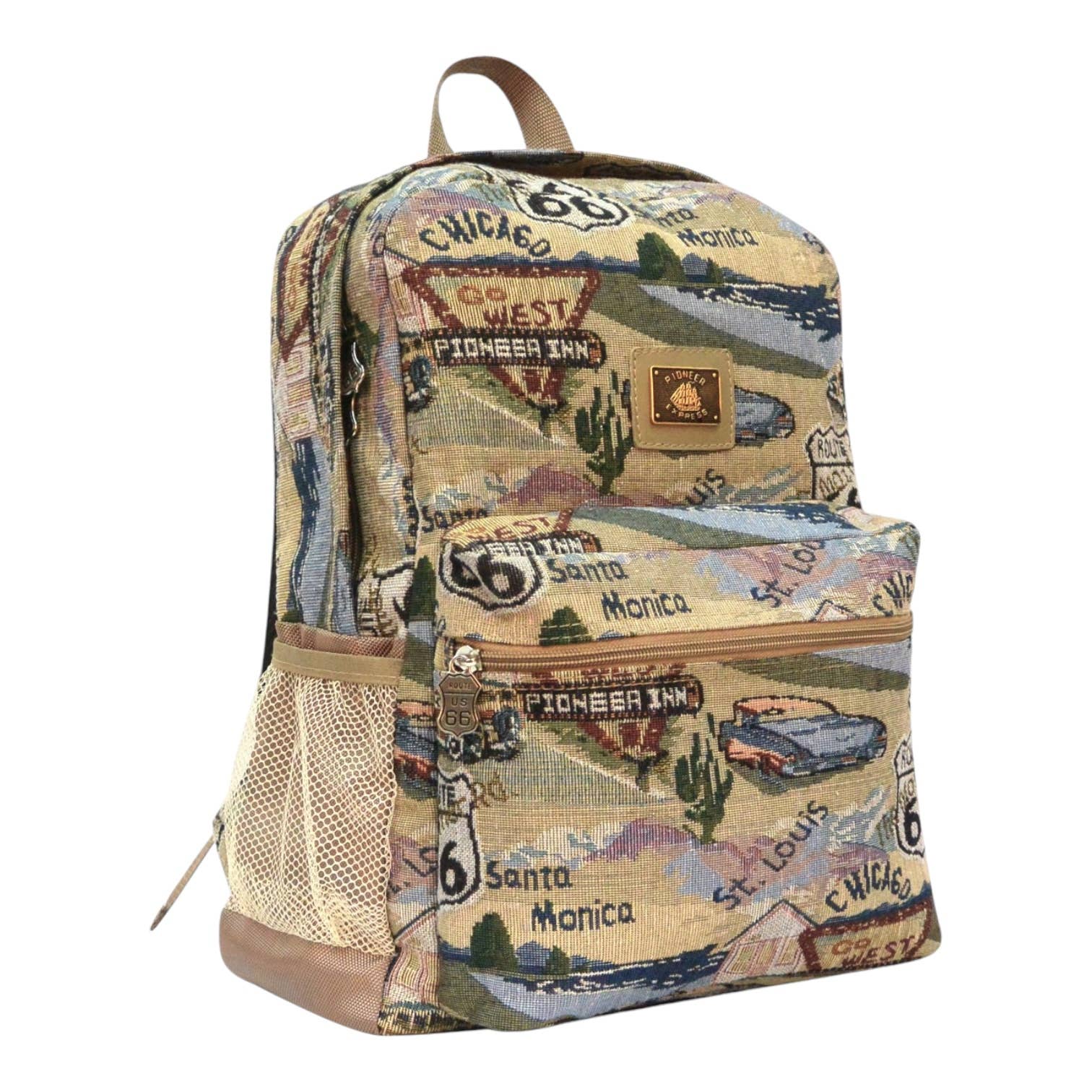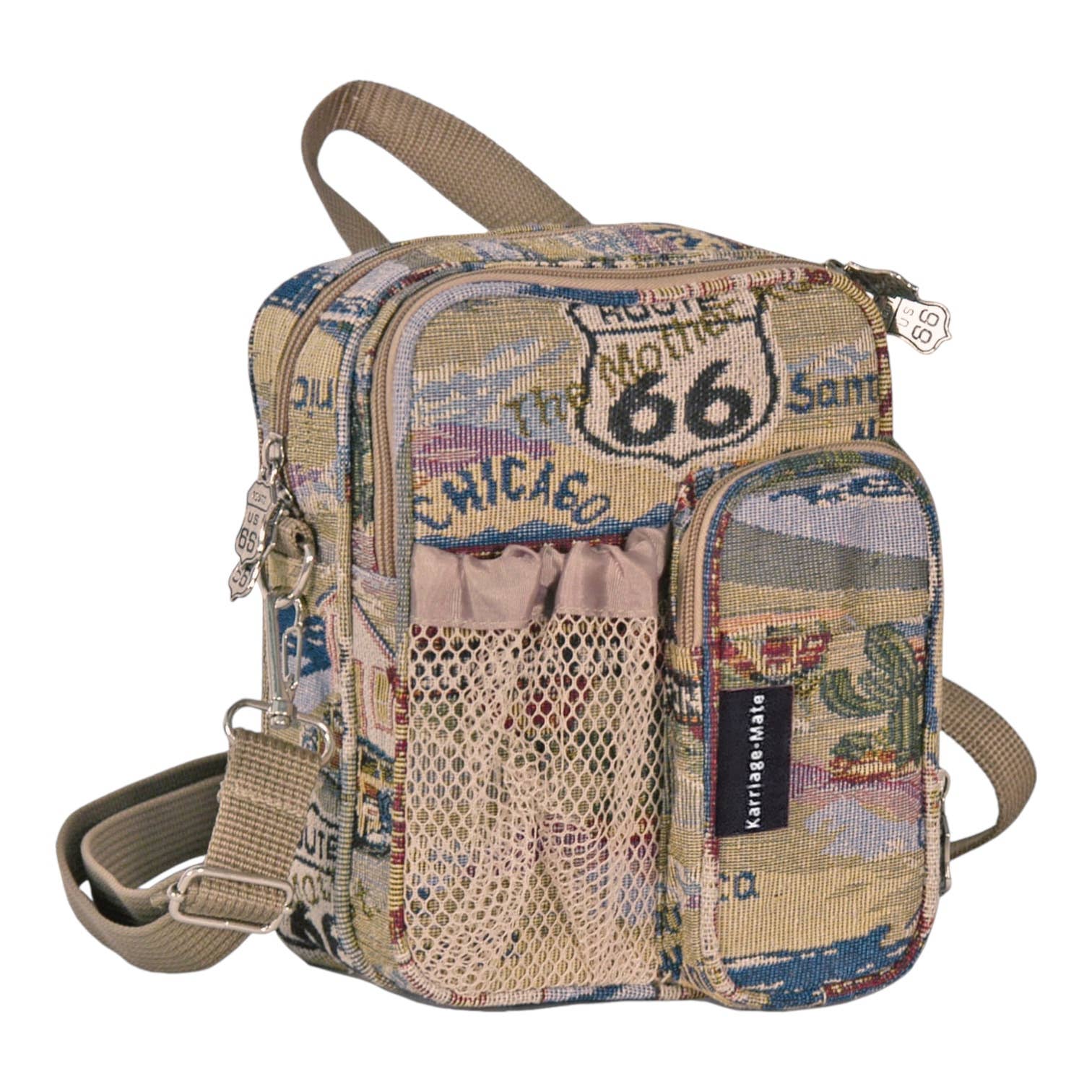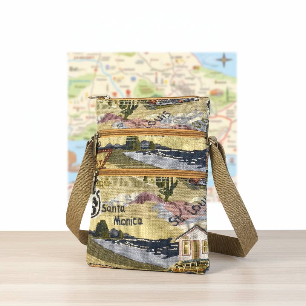This crossbody sling backpack from Karriage-Mate features vintage Route 66 tapestry fabric with iconic road trip prints. Designed for comfort and function, it includes: – Adjustable shoulder strap (left or right wear) – Front zip pockets and a secure D-ring loop – Compact, lightweight body with durable construction Great for travel, souvenir shops, or gift boutiques seeking Americana nostalgia in wearable form.