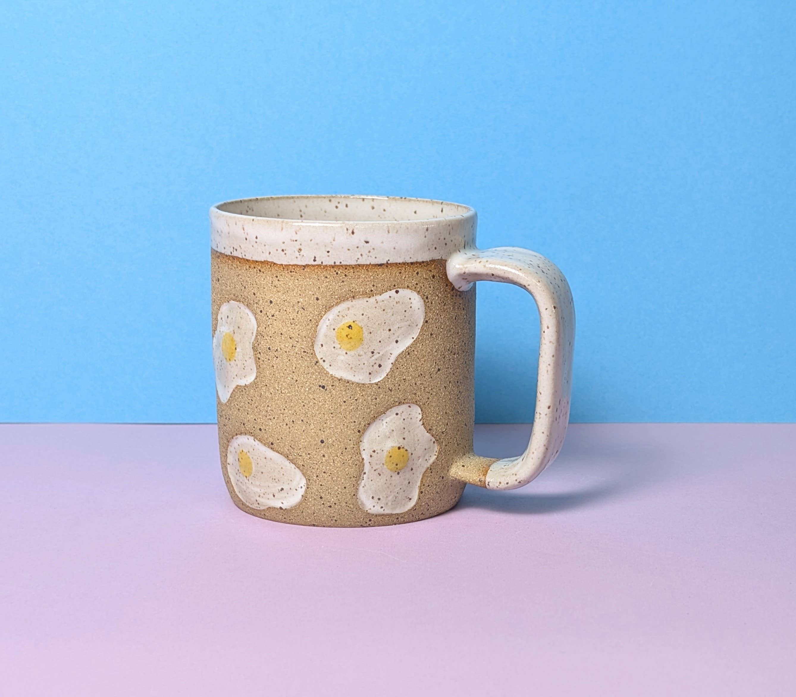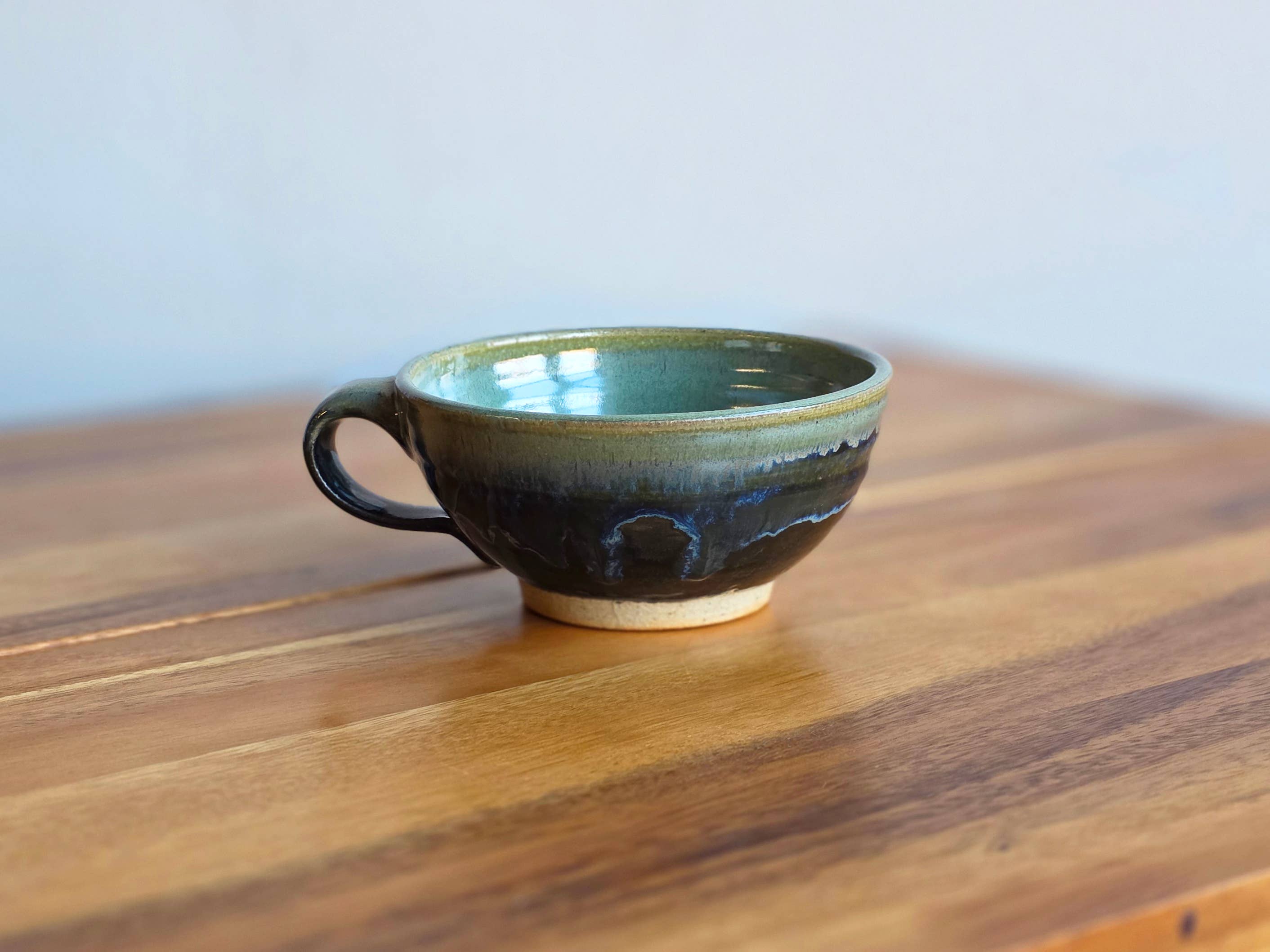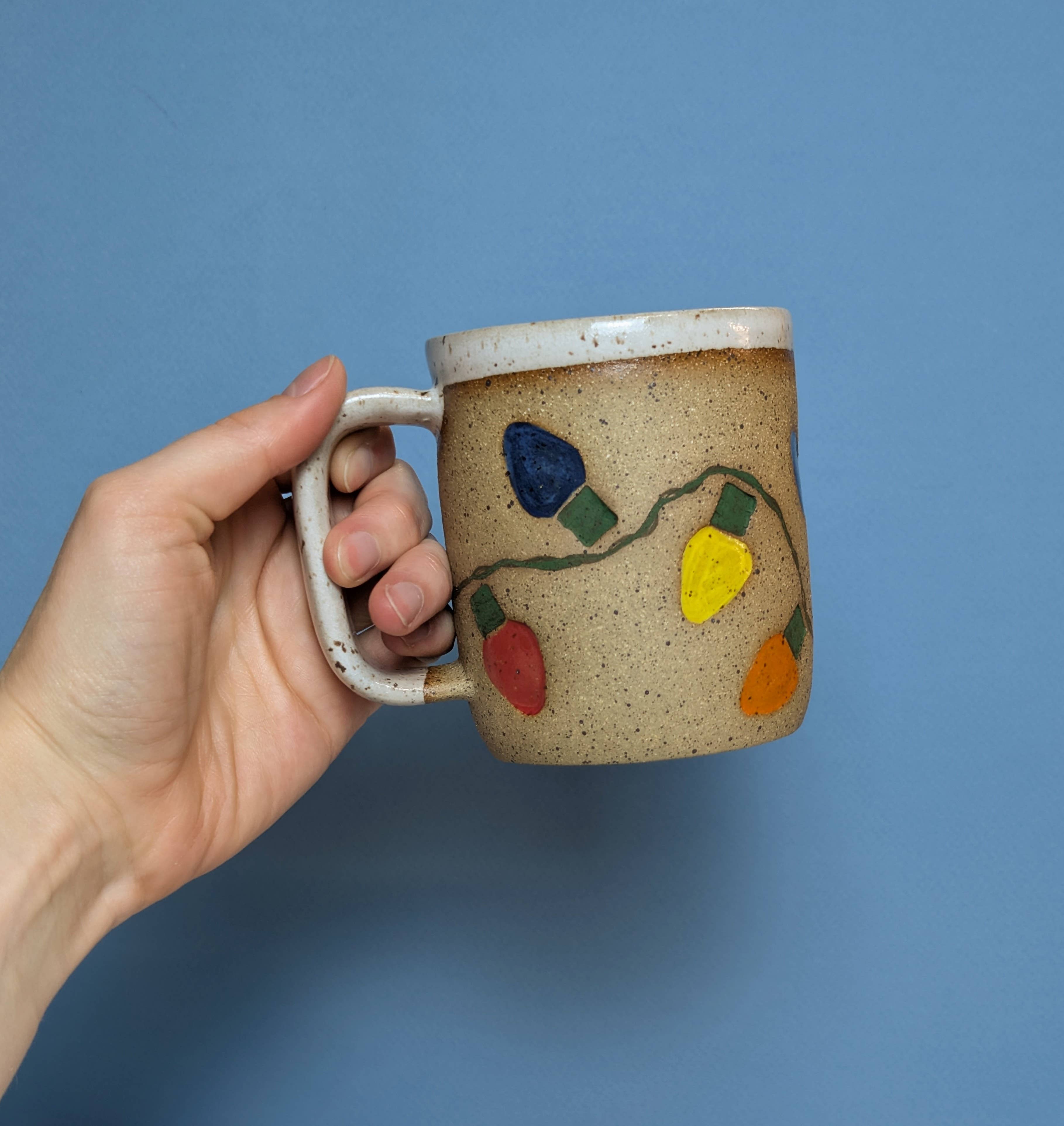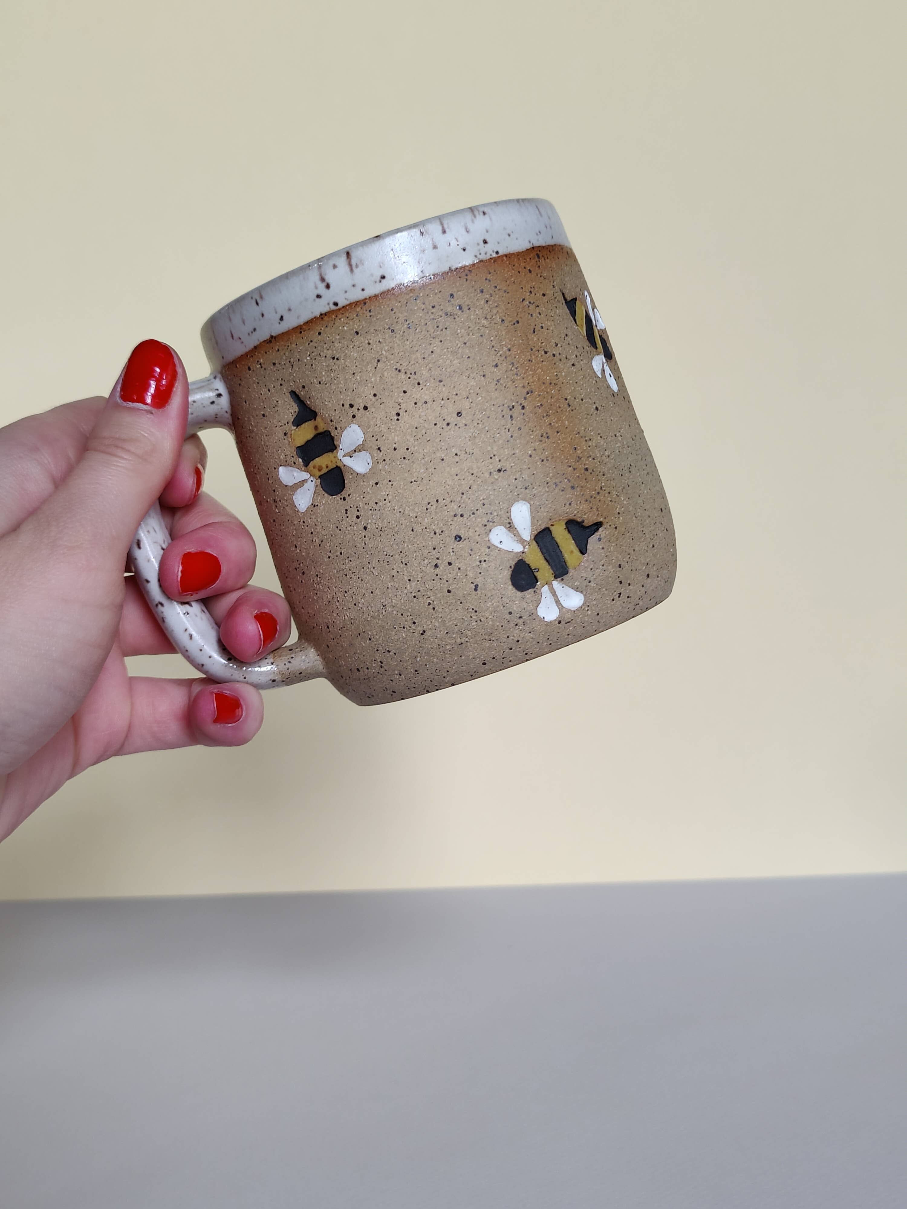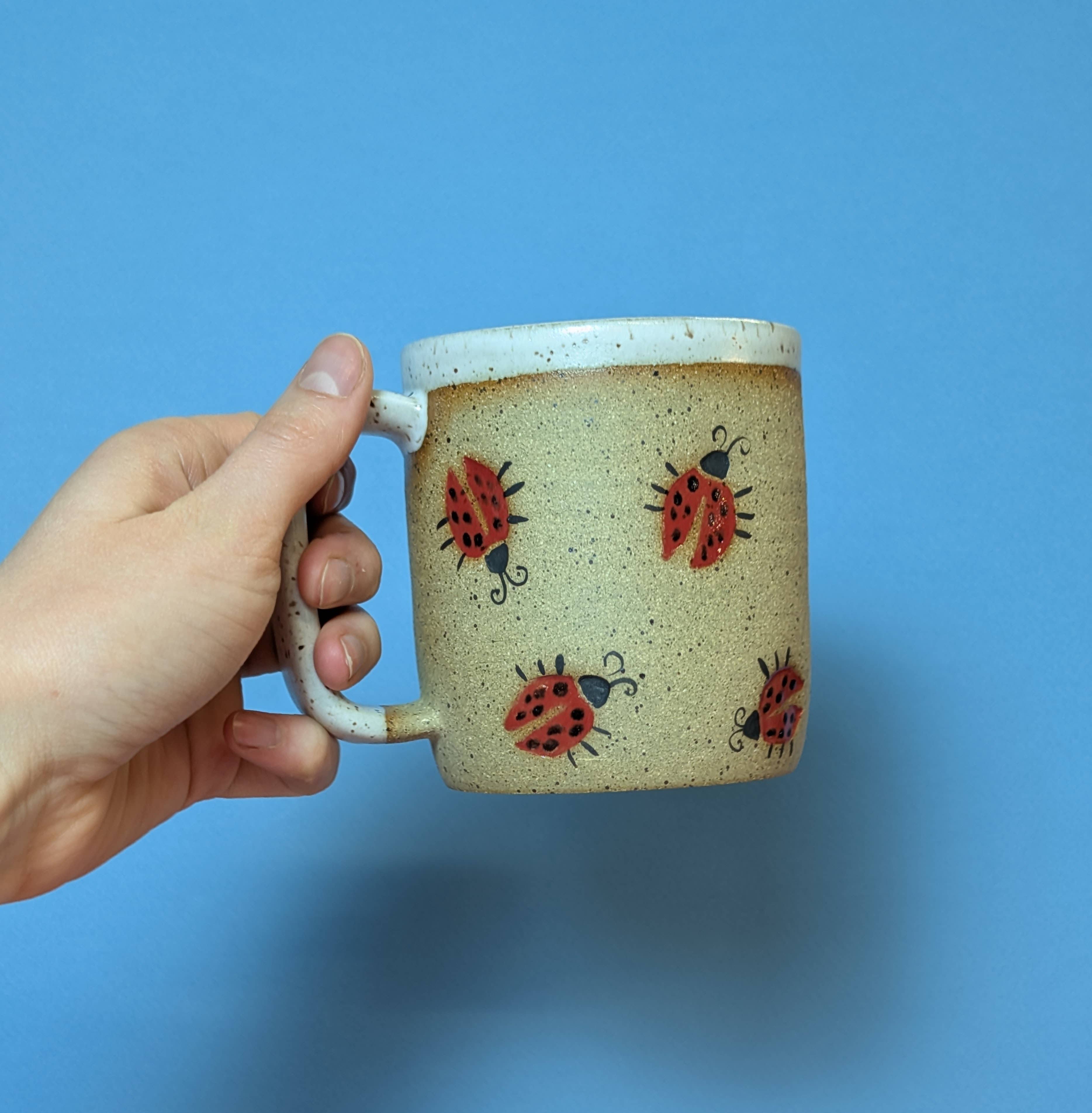 These mugs are thrown on the wheel and then a line of ants is stamped around the body of the mug. Each line will be different but they will always crawl in a squiggle pattern. The top, inside, and handle are then glazed a glossy speckled green. The ants are glazed a matte black. New green glaze color! Size guide: While some variation can be expected with handmade items, the sizes generally are: 8oz mug is 3 inches tall, 3 inch diameter. 12oz mug is 3.5 inches tall, 3 inch diameter. 16oz mug is 4.5 inches tall 3.5 inch diameter. Dishwasher and microwave safe. Made from stoneware clay.
