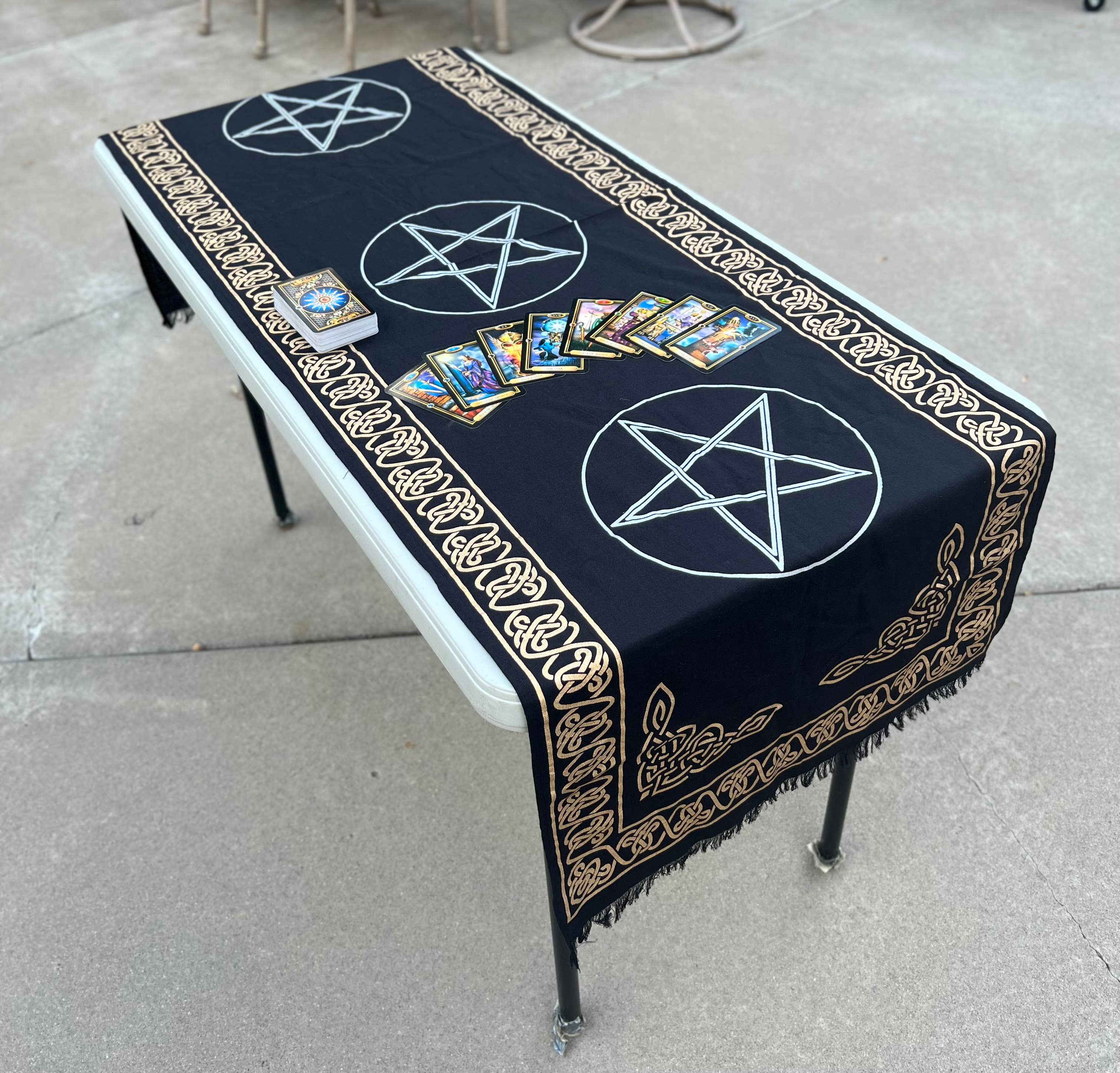❤ Size - Long 72 inches by 36 inches ❤ Heavy 100 % Cotton Fabric ❤ Silver Gold Manual Printing ❤ Fringes on all 2 Sides of the Cloth ❤ Use this beautiful Altar runner cloth to bless and grace your sacred Altar, a witchcraft kit, and a tarot Card reader, or Decorate your wall. ❤ This beautiful altar table runner can be a perfect gift for your loved one. ❤ Care: Hand Wash Separately in cold water, Hang in the air to dry. (dry-cleaning suggested)