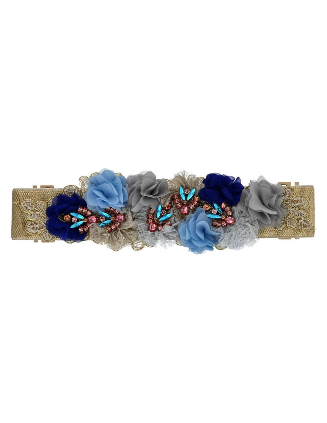 Party belt adorned with crystal, flowers, golden tassel, embroidered application and fantasy ornament. Our belts are made with an exquisite design and quality materials, and we also offer a wide variety of colors and shapes so you can find your style. Measures: ornament 30 x 12.5 cm, belt width 5 cm. Ornament dimensions: 20 x 6 cm. Rubber width 5 cm.
