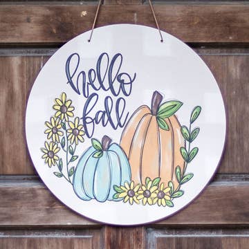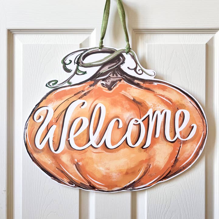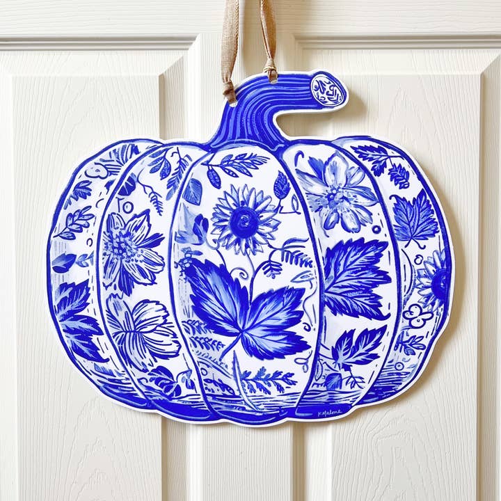 The Pumpkin Stack door hanger is perfect for fall. With an orange, white and teal pumpkin stacked on top of each other, you can have a non-scary Halloween or simple Thanksgiving door hanger for your outdoor decor. Also available in a double sided Pumpkin Stack / Snowman fall-to-winter door hanger. Waterproof and fade proof, this print of a digitally illustrated painting by New Orleans' artist Kristin Malone is UV printed on PVC board. Door hanger measures 22" tall x 13.25" wide x 1/4" thick. Hangs approximately 25" tall with ribbon. *Please note that any EXTREME changes in temperature may cause this door hanger to warp. This includes below freezing temperatures and abnormally high heat temperatures. I.E. If you have a metal door that is in the direct sunlight in during the summer, the excessive heat may cause the plastic to warp.