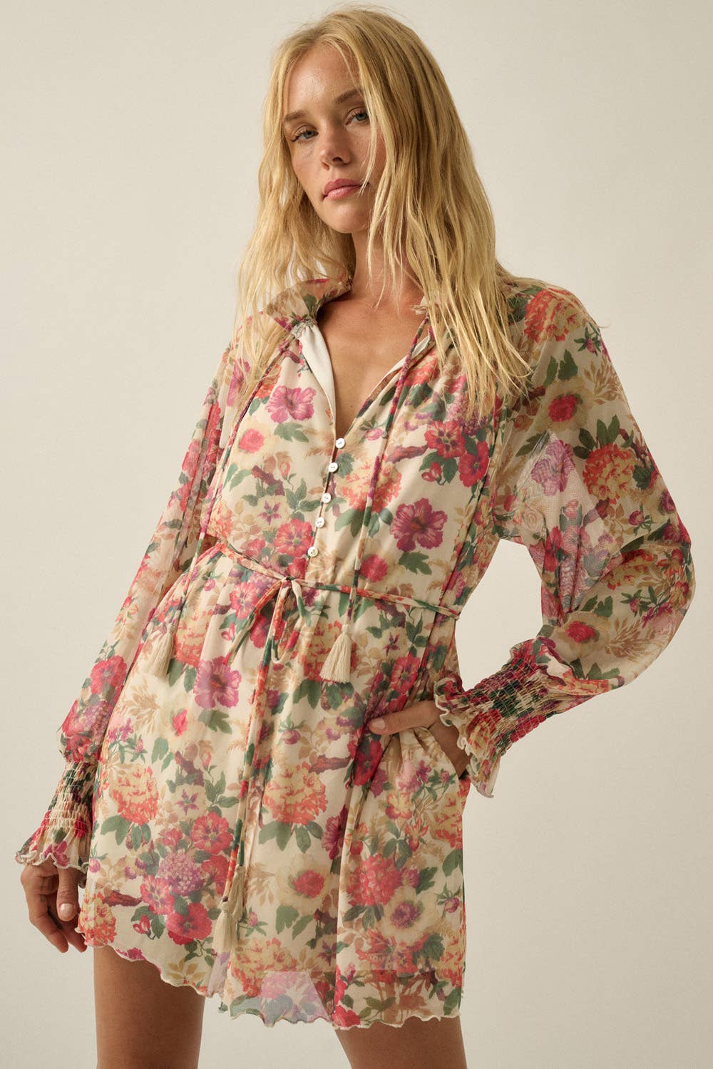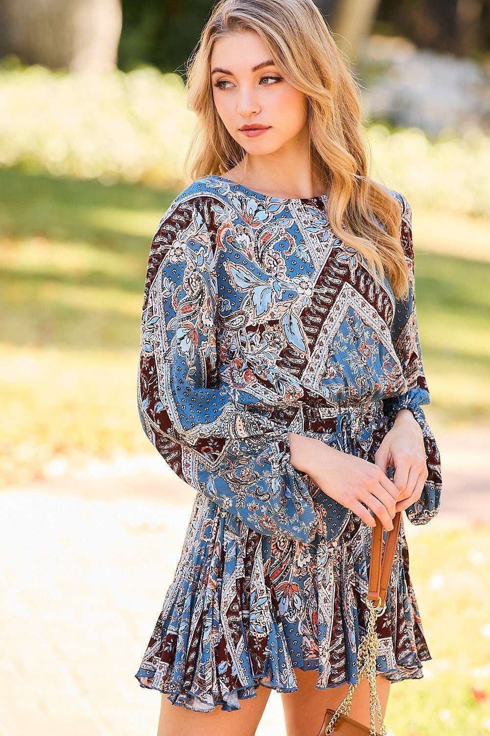 Our Jace Romper gives the femininity of a dress with the comfort of a romper! This fall romper features a v-neck, elastic wrists, a tie belt, and liner shorts inside. Her effortlessly flowy silhouette will have your customers looking fashionable and feeling great all day! Product Details: Fit: The Jace Romper fits true to size Length: The small measures to be 25.5" bust to hem Bust: Not Fitted - smocked back allows stretch Waist: Relaxed fit Hips: Relaxed fit Fabric: Fabric contains no stretch. Materials: 100% Polyester