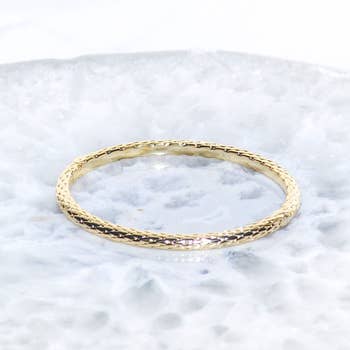 Elevate your wrist stack with a blend of modern artistry and robust durability! Our "Textured Hinged Water Resistant Bangle" is designed for the individual who demands both style and resilience from their everyday jewelry. The hinged design ensures a comfortable and secure fit, making it incredibly easy to put on and take off while maintaining its sleek, continuous form on your wrist. Water Resistant Inner Circumference: 6.5" Inner Measurements: 2.4" x 1.9" Hinged Closure (Apply light pressure to open & close) 18k Gold PVD Plated Stainless Steel PVD Plating offers a slightly darker gold tone